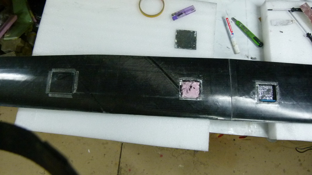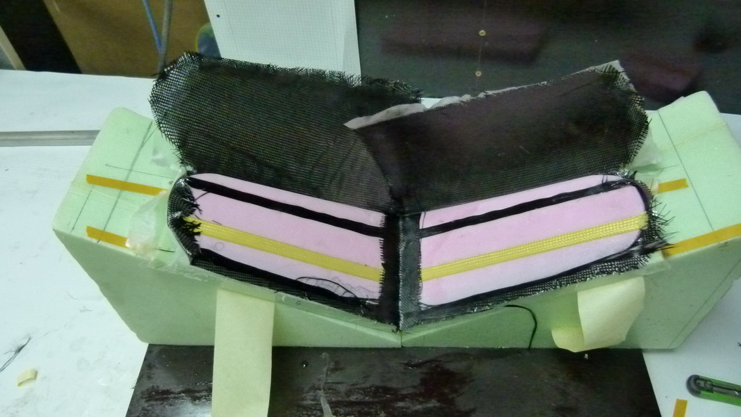 Lagenaufbau 50er glas in die Form je 6 bahnen 3 800k Cfk Rovings auf die ganze länge , nochmal 8 vorne ab mitte Tragfläche. Vorne und hinten 84gr Cfk und in der mitte 120gr Glas . Darauf nochmal je 1 lage 800k Rovings auf den 6 Bahnen .