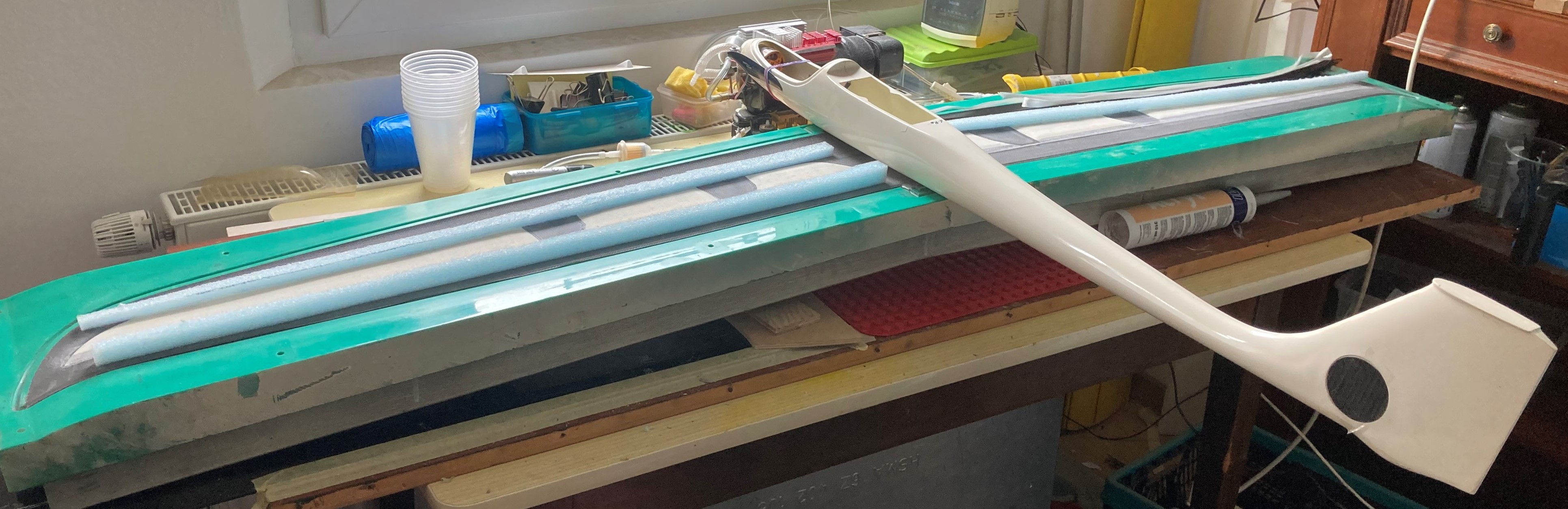 Am vergangenen Wochenende hatte endlich mal jemand Zeit mit mir die Form zu schließen. Alleine ist das nicht für mich machbar. Der Flügel ist inzwischen schon geschlüpft mit 665g grob besäumt und endfest. Ich bin zu 85,36% zufrieden mit dem Ergebnis. Fast keine Luftblasen in der Nasenleiste bis auf ...
