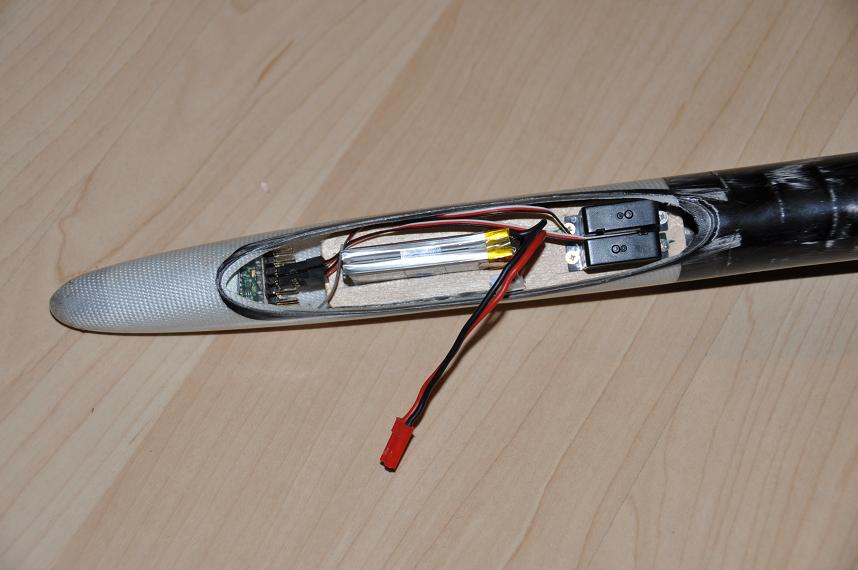 Auf den Fotos seht ihr einfach mal die Bauausführung, auch wenn am Leitwerk noch nen bissl PU Leim klebt *schäm* Als gute Idee erwies es sich die Löcher für die Torsionsfeder (0,5mm Federstahl) zu stechen und dann etwas PU Leim mit einer Spritze reinzudrücken. Dann die Feder rein und alles fixieren. So wird das Leitwerk von innen schön ausgeschäumt, somit verhärtet und die Feder arbeitet das Loch nicht aus. In das Rohr hinten am SR habe ich auch ein wenig PU Leim gegeben. So ist die Verklebung besser und das Rohr wird noch etwas stabilisiert am Ausschnitt. Als Schnur habe ich mir einfach etwas 0,10mm SpidreWire Core red von meiner Spinnrute geklaut. Trägt gut 6kg und sollte also locker halten. Am Ende der Schnur aus dem Rumpf eine Schlaufe gemacht und dann vom Ruderhorn mit einem Stück Schnur dadurch. So kann ich immer wieder einfach die Länge einstellen, ohne eine neue Schnur in den Rumpf einzufädeln. Der Empfänger ist ein nackig gemachter und anschließend eingeschrumpfter R6 ganz vorne im Rumpf. Die Servos stehen so auseinander, weil ich die Kabel dazwischen geklemmt habe. So musste ich die Servokabel nicht verlängern. Die Kabel für die QR habe ich einfach verlängert. Muss also am Empfänger stecken, aber der Flieger bleibt eh montiert. Zu guter Letzt habe ich das Wurfblade mit Endfest 300 eingeklebt und auch wieder getempert. Allerdings nur bei 40° in meiner Box um die Fläche nicht zu gefährden. Finde das Blade sieht recht sexy aus und ich bin sehr gespannt auf die Wurfhöhen morgen. Heute kam ich ohne Blade mit bissl Gegenwind auf gut 30m!