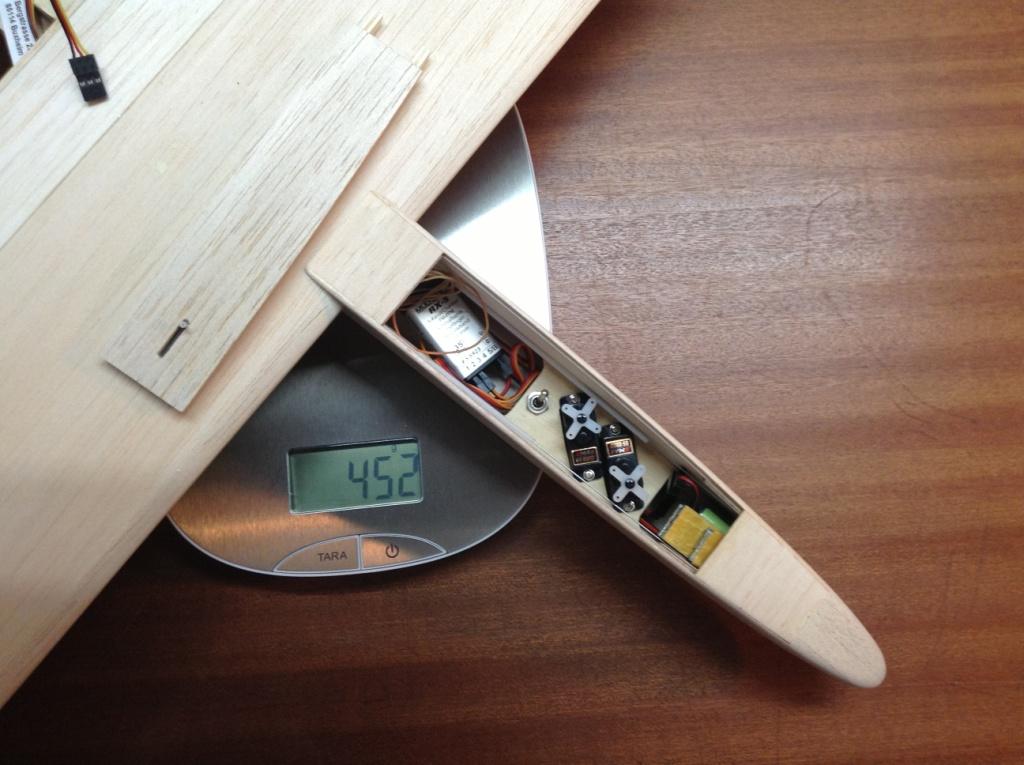 Das vorläufige Gesamtgewicht beträgt derzeit (ohne Bespannung!) mit allen Einbauten incl. vorgehaltenem Ballast 452g. Wenn man großzügig 1,5 qm Folie Oralight mit ca. 60g ansetzt, wird die Baba-Jaga knapp 510g haben.