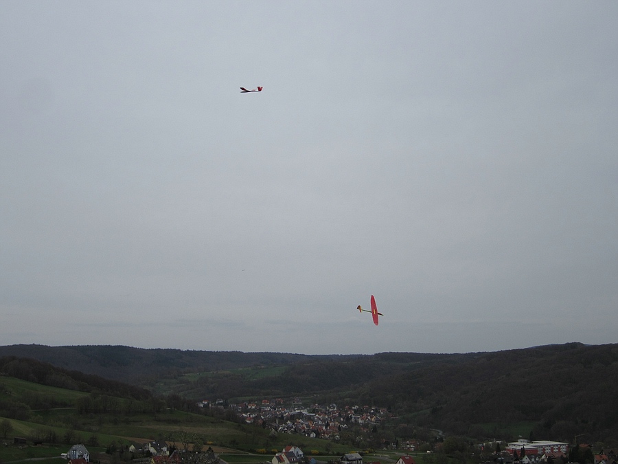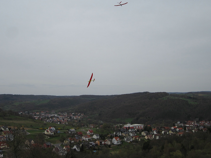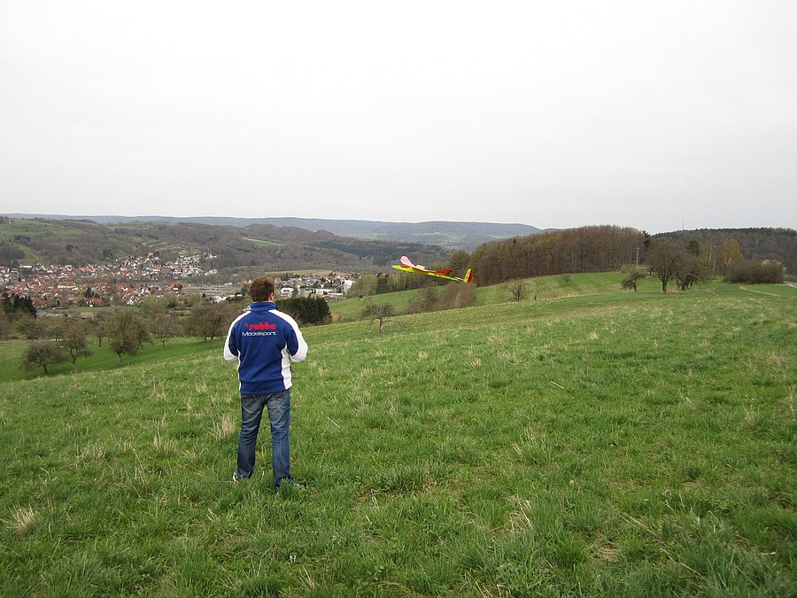 ...und die Absaufer trotz Hangwind hab ich nicht gefilmt :roll: Tobi hat zwar ein paar mal ziemlich weit unten im Tal Anschluss gefunden und wieder sauber hoch gekurbelt, aber er hat es auch mal überreizt und musste den Flieger zu Fuß von unten holen. An dem flachen Hang reicht der Hangwind nicht um oben zu bleiben und ist mehr eine Handstart-Flugzeitverlängerung für die Thermiksuche ;-)