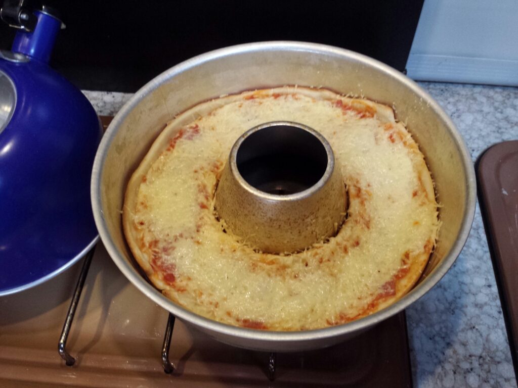 Heute musste es schnell gehen, deshalb gab's Kringelpizza aus dem Omnia-Ofen. Einfach von Fertigpizzateig 2x 12cm breite Streifen schneiden, in den gefetteten Omnia legen, Soße usw drauf, 12-15min je nach Belagsdicke auf kleiner Flamme backen, ferdsch und legger. ...und jetzt ab in den Refra-Raum, ein paar arme Leute mit doofen fragen quälen