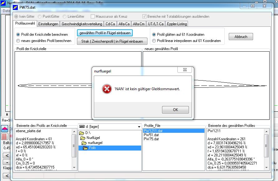 Innen habe ich das PW75 unverändert gelassen, aber dann die nächste PW75-Stützstelle weiter nach außen geschoben und dort mit einem leicht aufgewölbten und etwas ausgedünnten PW75 besser auf die höhere Auftriebsbelastung bei niedrigerer Re-Zahl angepaßt.