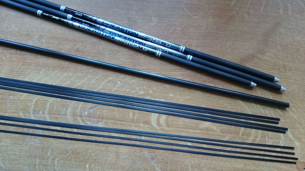 An cfk Material werden 3 Pfeilschäffte "Eston Fatboy" stärke 340er. 1x 8mm cfk Rohr und je 4x 4x1mm / 3x1mm in 1m Stücken benötigt.