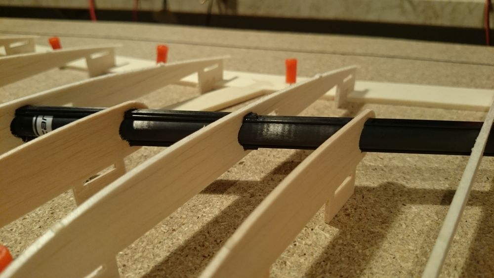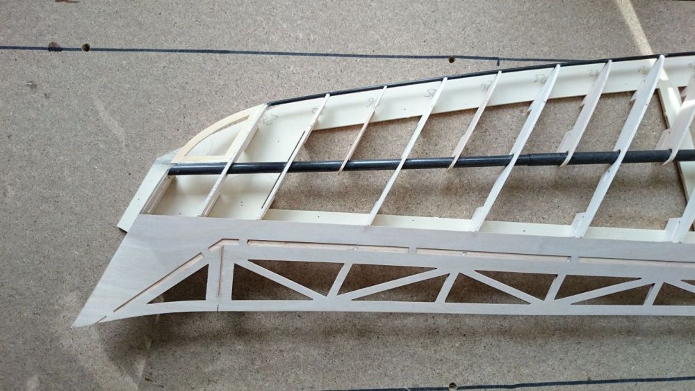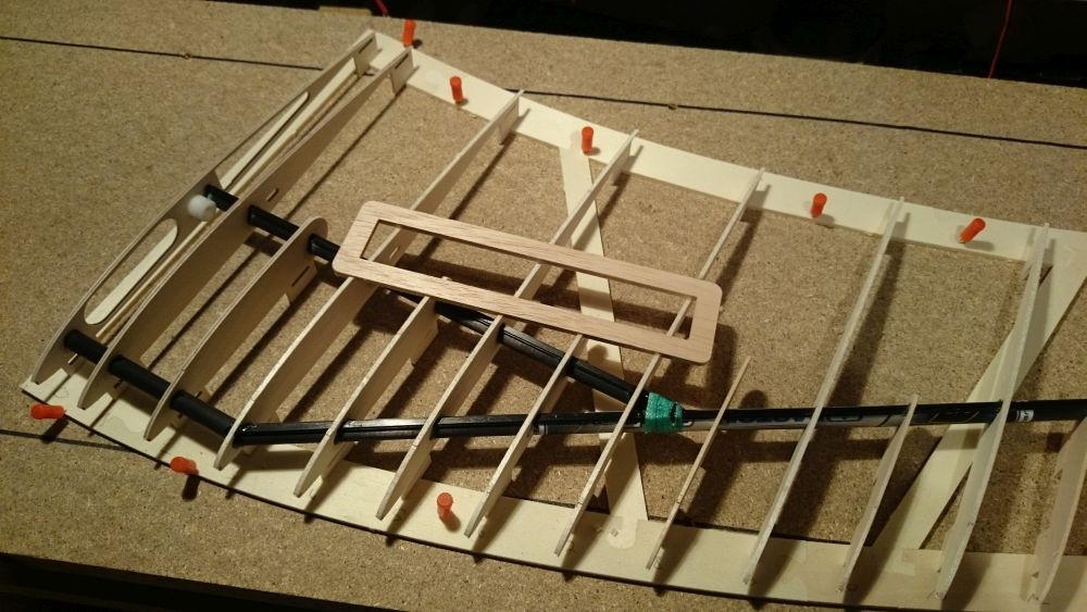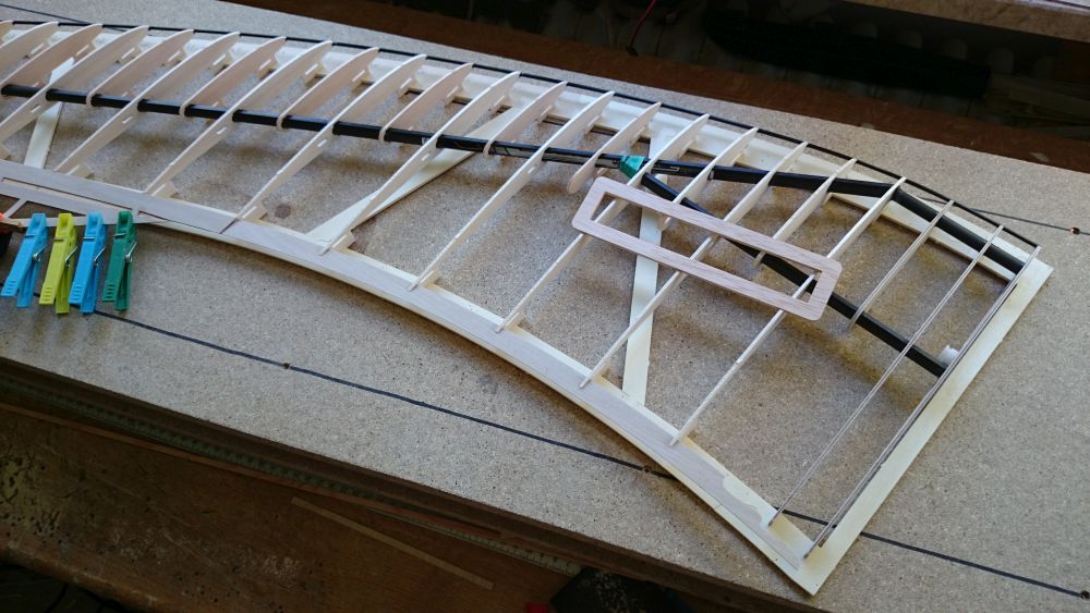Diese hat mir bei der Planung fast den Verstand geraubt. Paralell zur Flugrichtung also gerade wäre sie nur mit Verwindung rein gegangen bzw. wäre auf der einen Seite dicker gewesen was vielleicht später zu einem Verzug geführt hätte. So geht sieh nun spannungsfrei und gleichmässig dick rein.