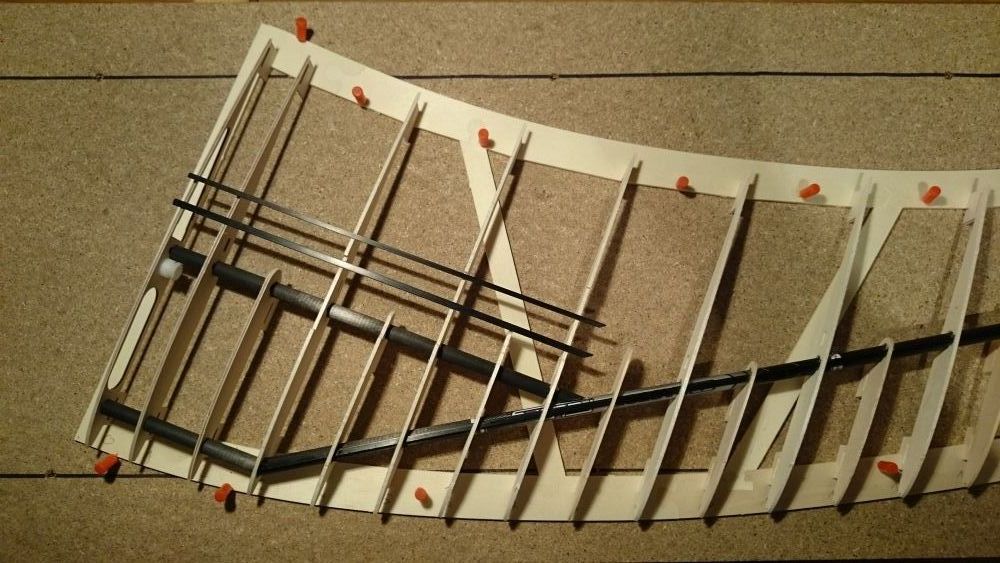 Vom 3x1mm cfk 410mm, 4x1mm cfk 650mm, 800mm vom Pfeilschafft und am Flügelende zum Winglet hin 340mm 8er cfk Rohr.