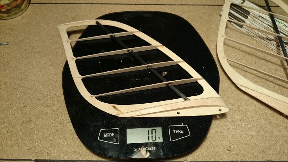 Die Winglets konnte ich auch schon mal mit Vliesresten bespannen, die Küchenwaage schwankt nach 2 anstrichen mit 50/50 verdüntem Spannlack nun bei 11 - 12g.