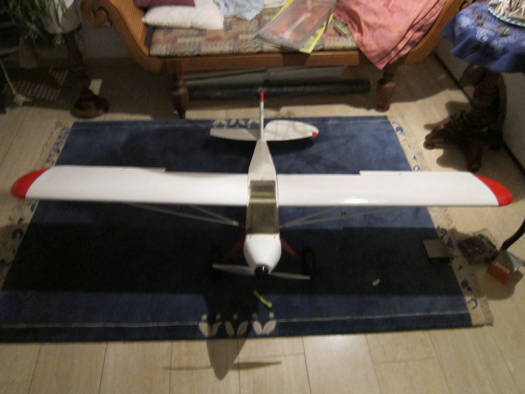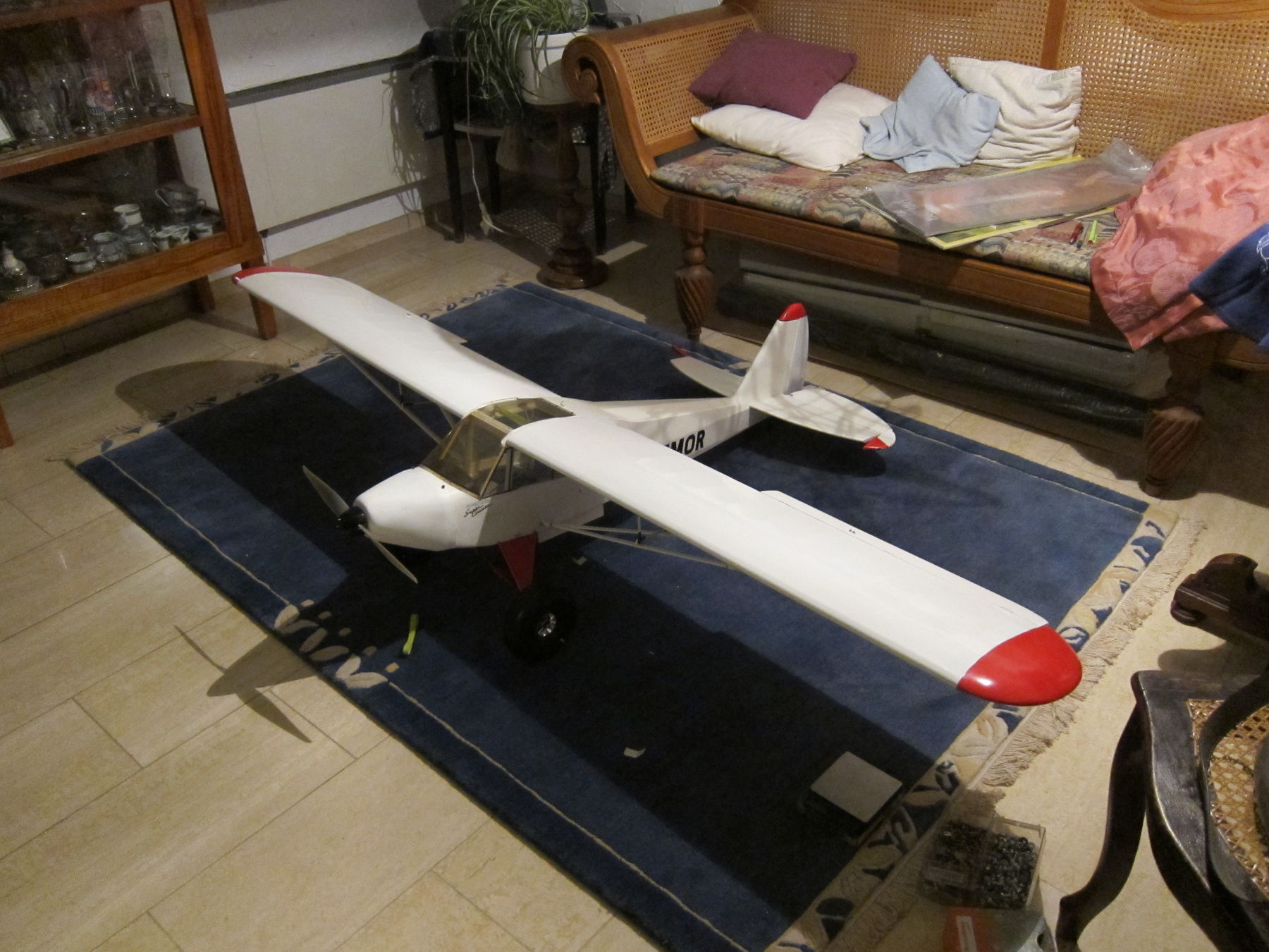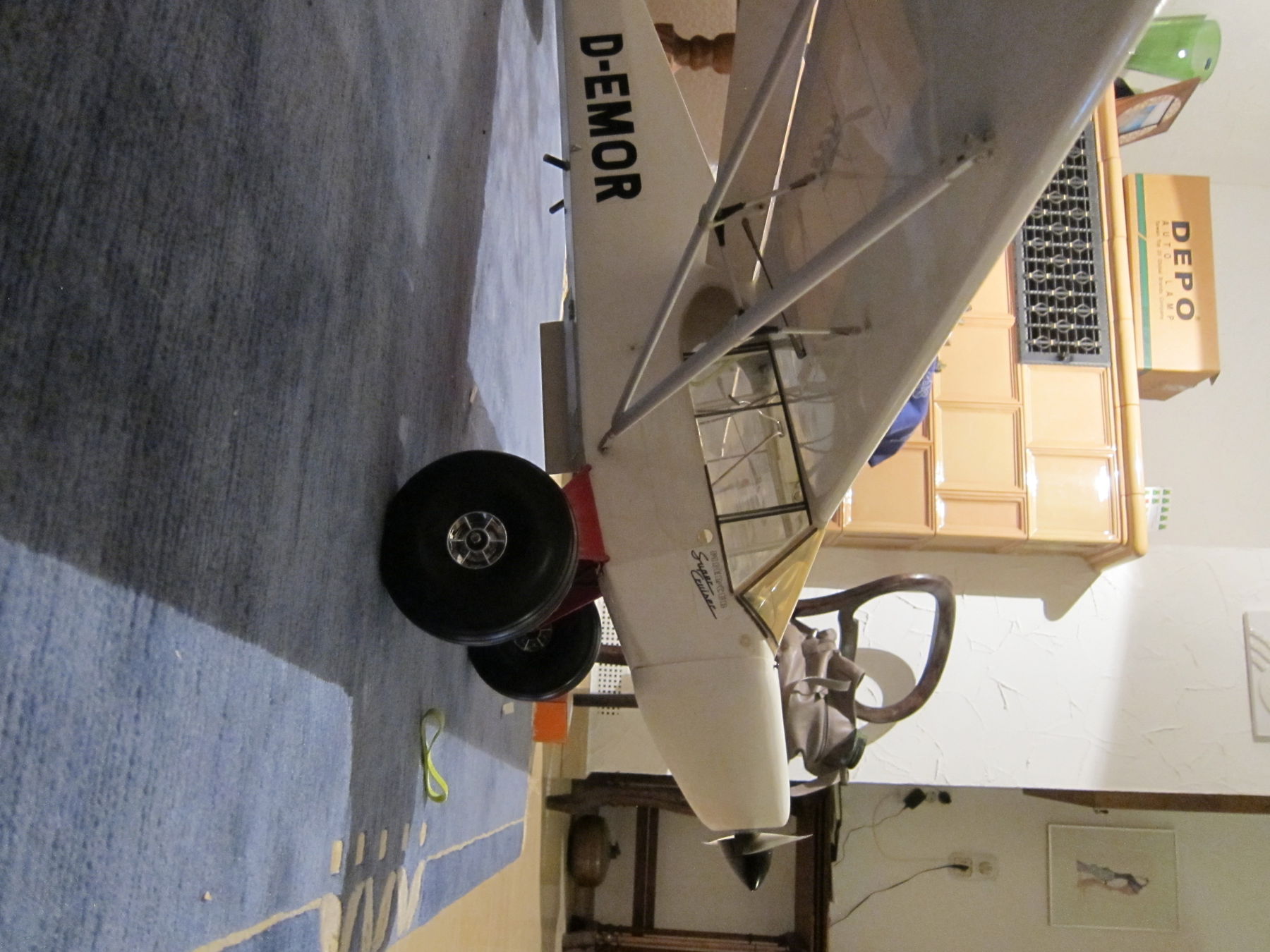 Wie man sieht ist noch ein bisschen was zu machen -- z.B. das Spornrad, und irgendwie muss der Akku wohl ein "wenig" weiter vor. Sonst könnte er nämlich nur direkt an der Firewall (etwa am Anfang der Motorhaube) sitzen. Das wär ... selbst mit 5800mAh 6S zu wenig um den SP hinzukriegen, und bei 4.2kg ohne Akku muss das nicht sein.