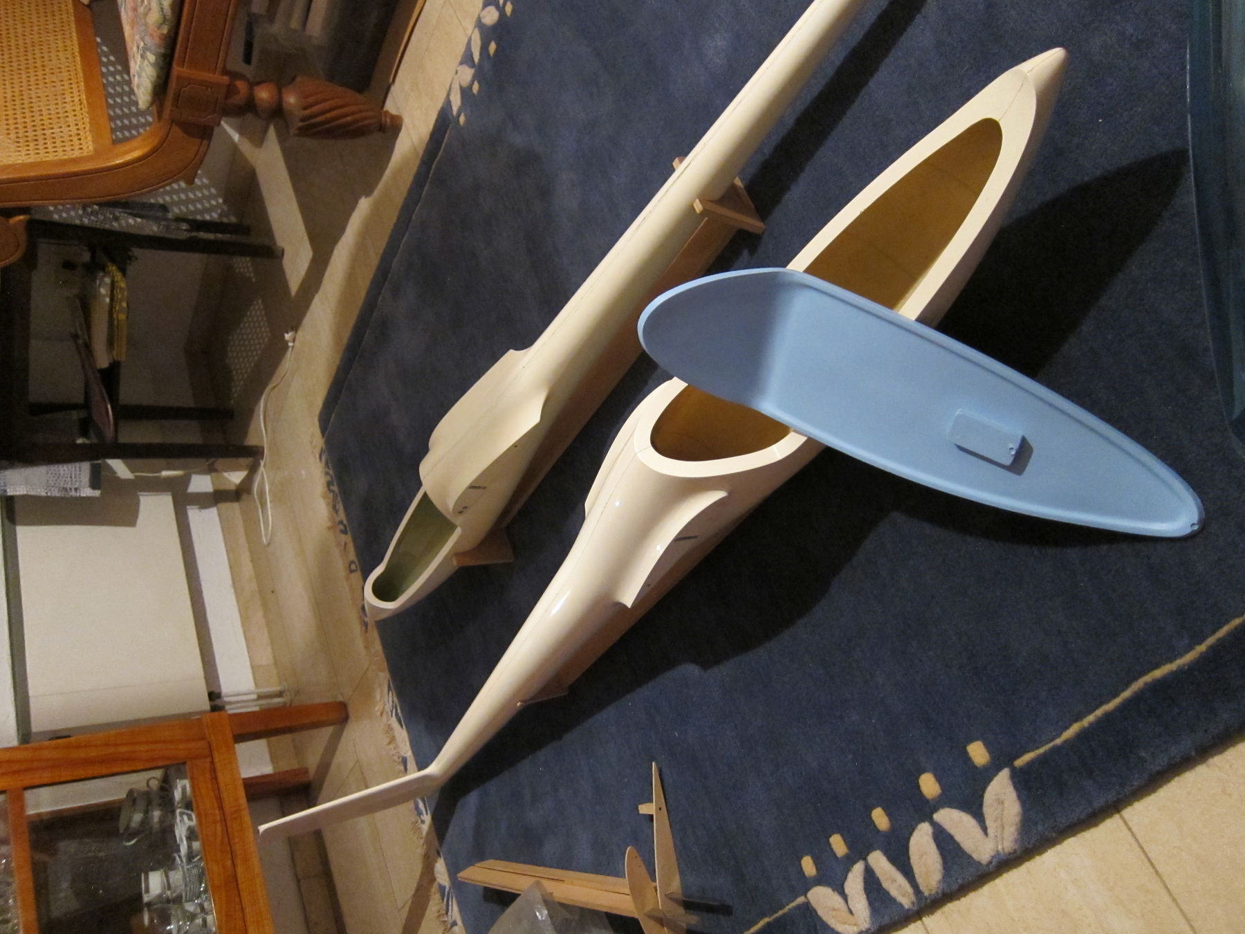 Keine Ahnung was das alles wiegt, keine Ahnung wer das was von gebaut hat. Das Fahrwerk hat wohl mal ein Schempp-Hirth Mitarbeiter nach Oginoolplänen angefertigt. Die Flächen sehen richtig gut aus, das wird wahrscheinlich irgendwer professionell gemacht haben.