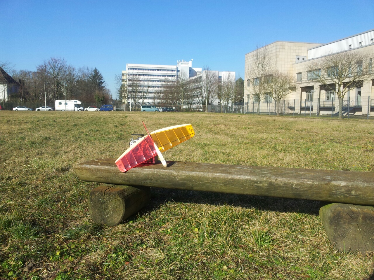 Längste Flugzeit war aus ~7-10m Starthöhe ca. 2:45min. Garnicht schlecht dafür dass der Flieger bei Rechtskurven über die Fläche abkippt, und daher nur linksrum kreisen kann. :D