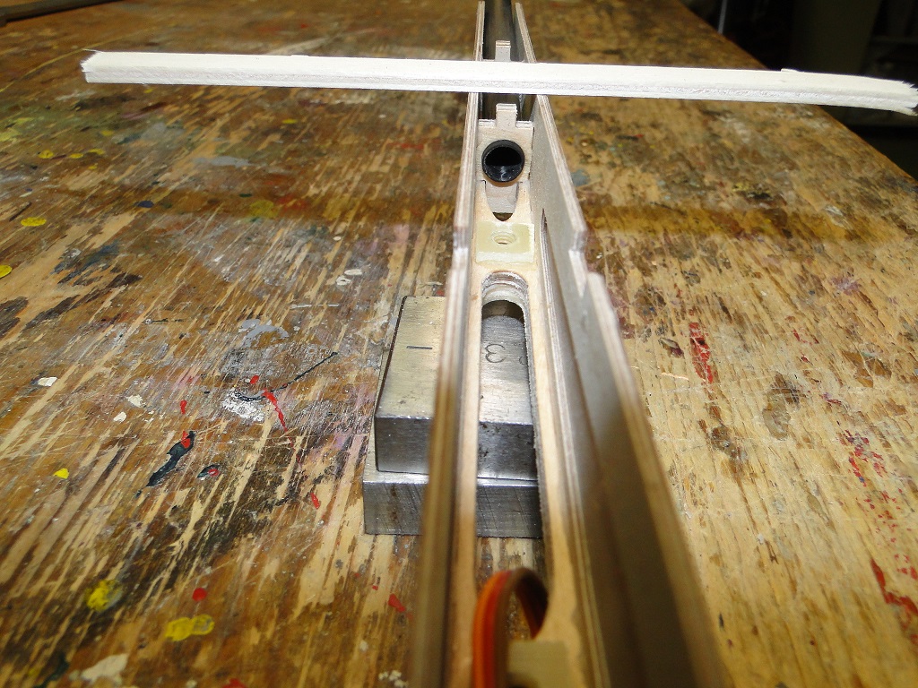 Die Verbinder werden in eine Flosse geklebt, hierbei habe ich das Reststück vom Leitwerksträger eingefädelt damit ich sicher war das alles in der Flucht ist.