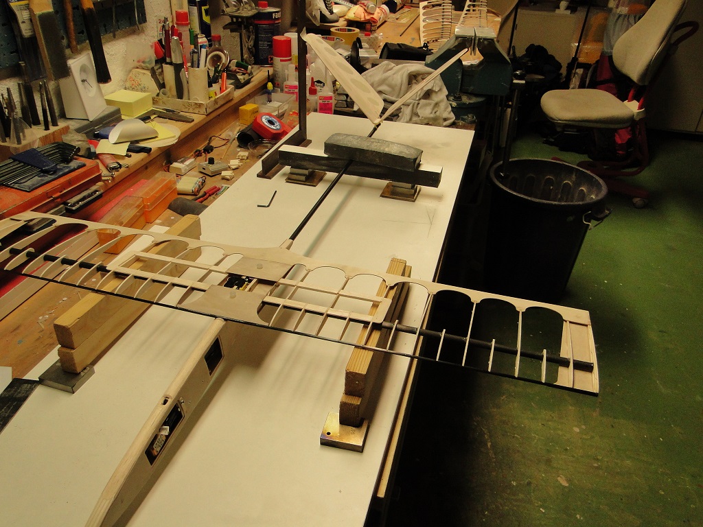 ich fang mal an den Flügelbau aus meinem Gedächtnis wieder hervorzukramen und hier die Bilder einzustellen. Ist vielleicht manches auf auf der beigelegten CD enthalten, aber vielleicht will sich jemand ein Bild machen bevor er den Bausatz bestellt. Ich fand die Bauweise auf einer beschichteten Platte mittels einer Helling ganz interessant, hab ich vorher so noch nie gesehen.