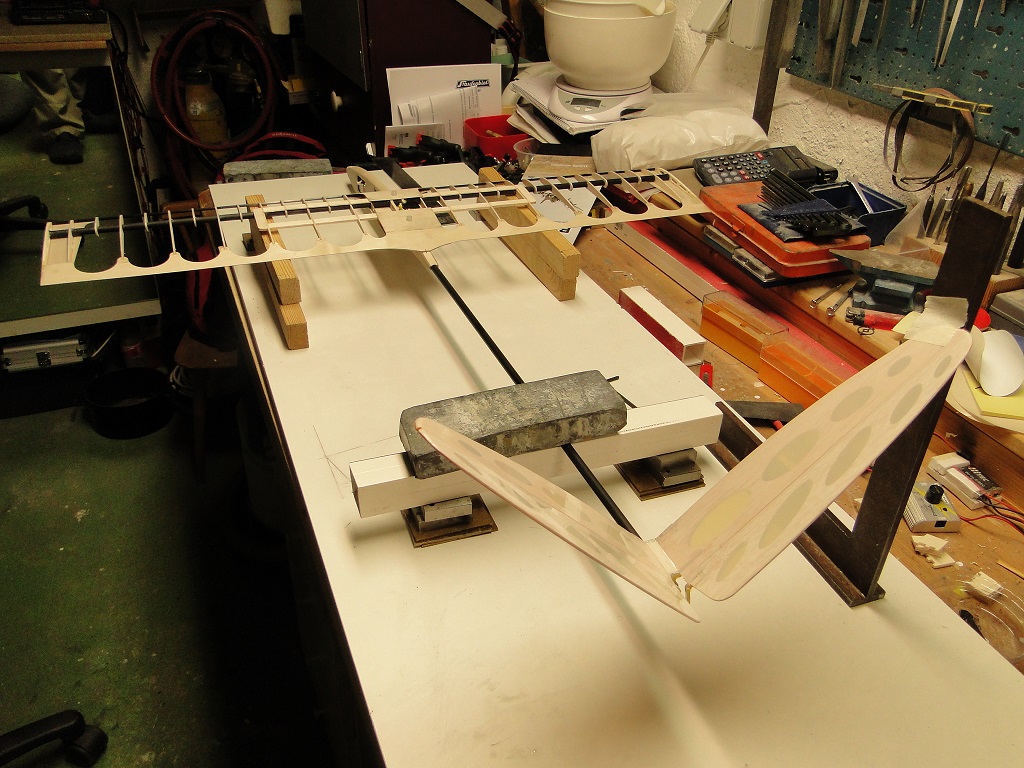 ich fang mal an den Flügelbau aus meinem Gedächtnis wieder hervorzukramen und hier die Bilder einzustellen. Ist vielleicht manches auf auf der beigelegten CD enthalten, aber vielleicht will sich jemand ein Bild machen bevor er den Bausatz bestellt. Ich fand die Bauweise auf einer beschichteten Platte mittels einer Helling ganz interessant, hab ich vorher so noch nie gesehen.