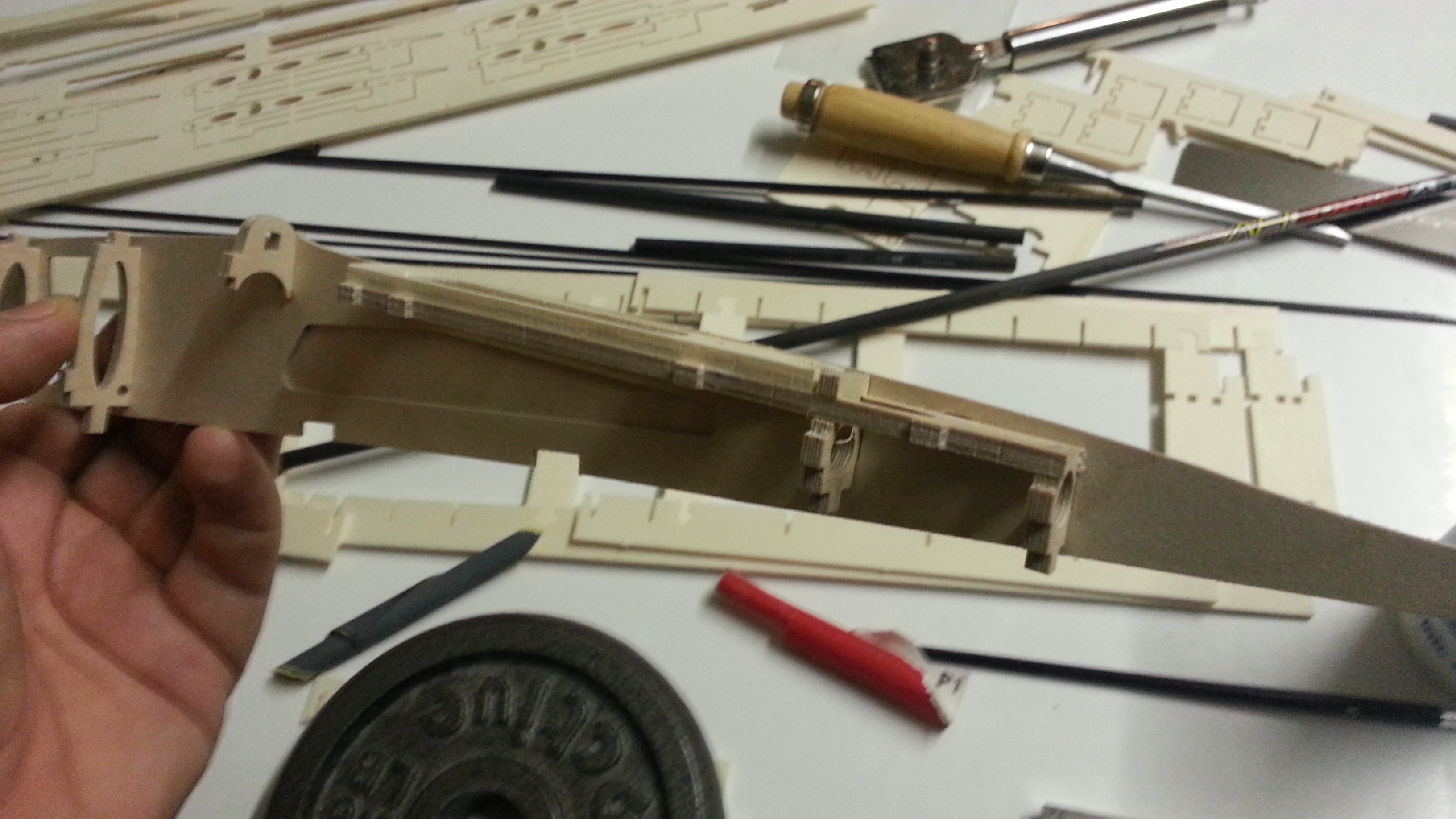 Jepp, so isses gedacht. Ich hab die Spanten in die Flächenaufnahme eingeklebt und dann diese Baugruppe in eine der beiden Rumpfseitenwände eingeklebt während sie flach auf dem Tisch liegt. Nach dem Kleber aushärten die andere Rumfseitenwand da drauf. Danach hab ich den Rumpf senkrecht gestellt, die vorderen Spanten eingesteckt und bei lose eingestecktem Heckrohr ausgerichtet und verklebt.