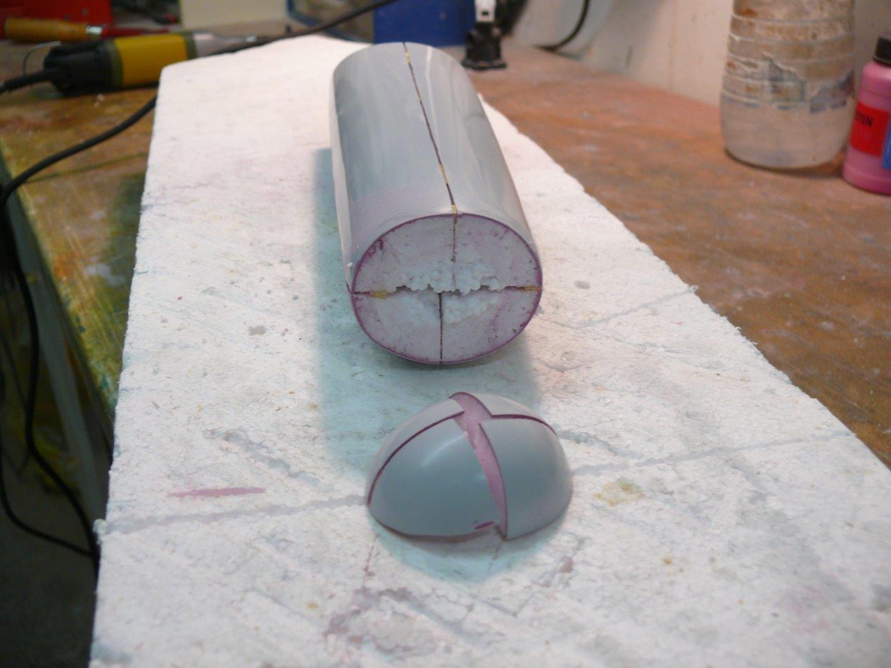 danach durch einen Saegeschnitt hockkant und einen weiteren quer 4 Kuchenstuecke aus der haube machen und etwas reduziert wieder zusammenkleben, bis das erste Haubenteil aus der Form gut drueber passt, dann den rest fertig modellieren mit entsprechenden Aenderungen?!