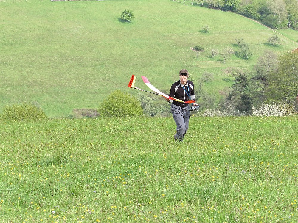 Heute hatte ich einen Tag Urlaub und hab den Nachmittag bei schönem Wetter und angenehmen Frühsommertemperaturen am Hang verbracht. Obwohl Windfinder für heute 1 Windstärke weniger voraus gesagt hatte waren die Bedingungen erheblich besser als beim Besuch von Gert und Sepp mit ihren Frauen Gestern, als wir vor allem die schöne Aussicht vom Felsen genossen haben, incl. Ausflug ins Unterholz zur Modellbergung wegen Absaufer nach kurzem Flug aus der Flitsche von Sepps Insect. Zum Glück hat das kleine Kerbtier nur einen Kratzer in der Nasenleiste abbekommen.