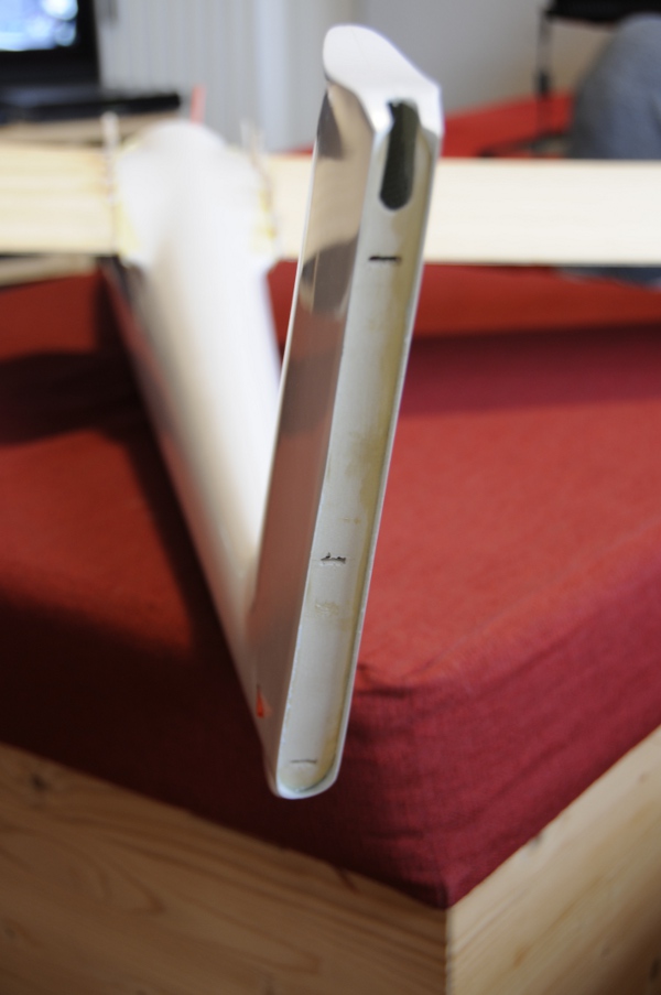 Die restliche Flaeche ist sehr steif und fest- scheint in Ordnung. Ich kann mir das nur so erklaeren, dass ich das Harz in der Schale von der Schaumrolle nicht anstaendig verruehrt habe. Eine neue Flaeche zu bauen habe ich im Moment keine Lust.