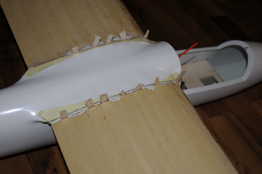 Heute wurden die fertig besaeumten Flaechen mit dem Rumpf provisorisch verklebt, morgen, wenn das 5 Minutengummi fest ist, werden die Verbinderhuelse und Torsionsrohrchen gut eingeharzt.