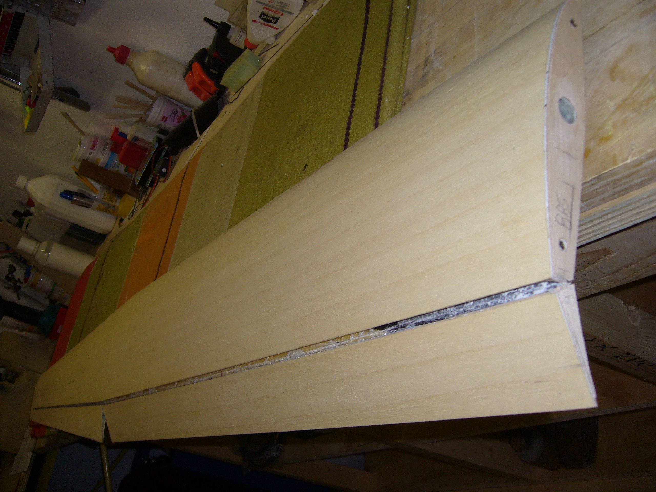 Das Hoehenleitwerk muss ich leider noch einmal machen, abgesehen dasss es etwas zu schwer war, vermurkste ich das Auftrennen des Ruders,- am Ende hatte ich anstatt einer klainen V-Kehle eine etwa 5mm breite Meganut. Ungenuegend, setzen. Werde es in Rippe bauen und mit Balsa beplanken.