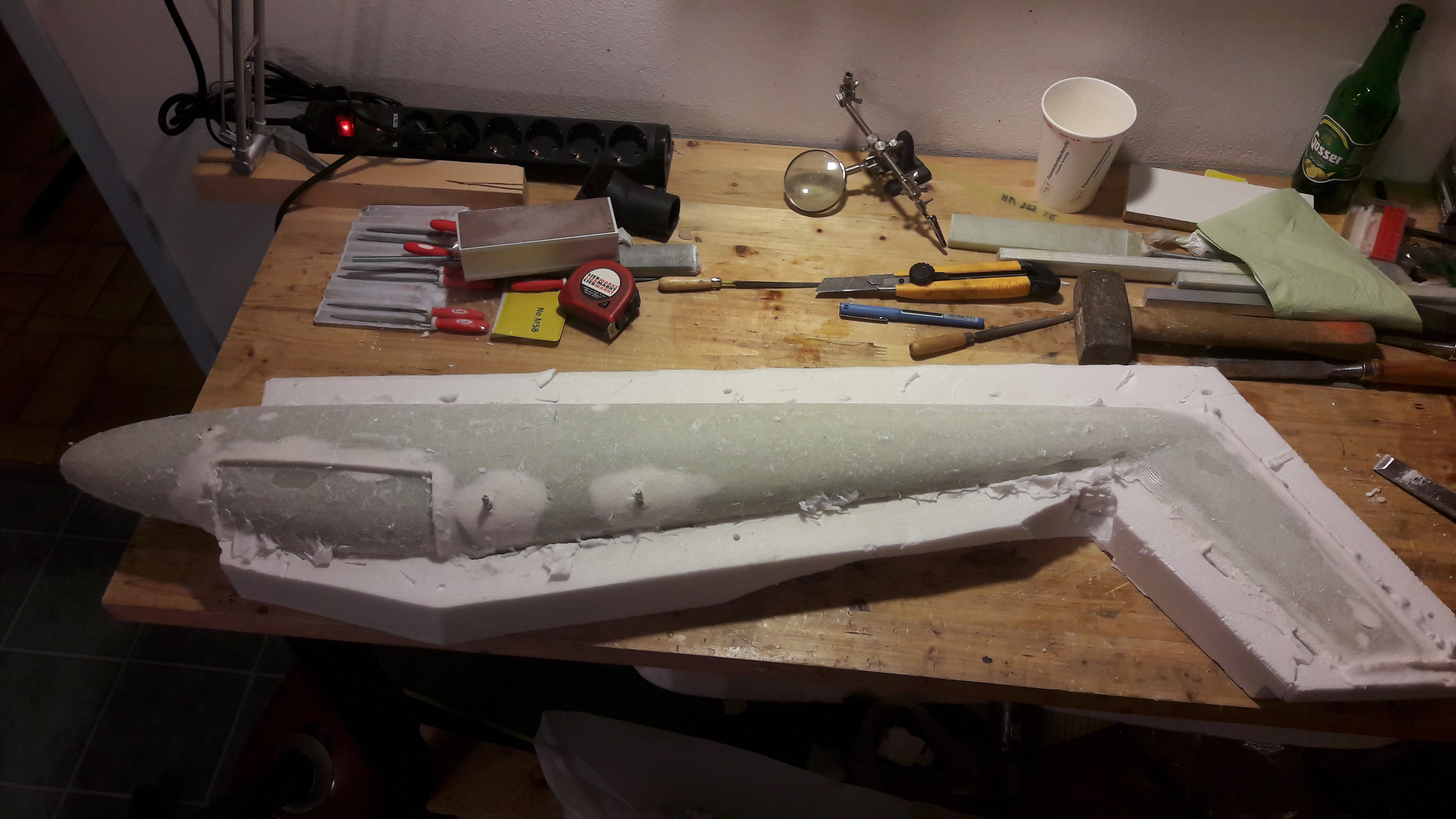 Ein paar Jahre später (Mai 2016) habe ich dann den Rumpf einfach auf 1:6 skaliert und eine Negativform davon aus einer 50mm dicken Styrodurplatte gefräst. Zuerst musste mit einem großen, langen Fräser geschruppt werden (ich nahm einen 8mm Zweischneider); danach wurde mit einem 3mm Fräser geschlichtet. Der Versatz weiß ich nicht mehr genau...