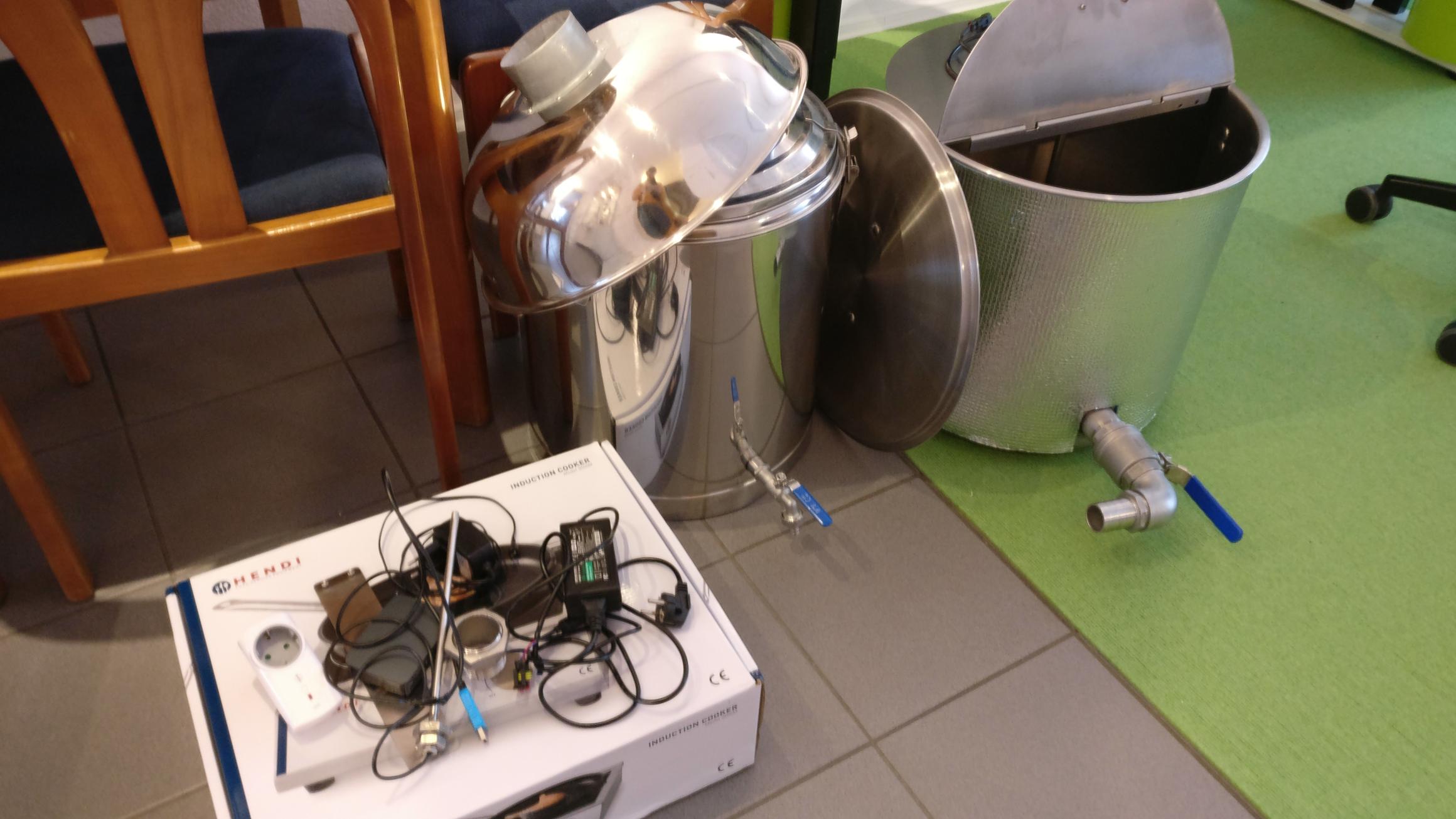 Eine neue Brau-Anlage! 68Liter Kessel zum Maischen und Hopfenkochen mit Rührwerk und Brüdenhaube, ein isolierter 38l Läuterkessel, fette Hähne für alles, eine 3.6kW Gastro-Induktionplatte und Funksteckdose, Thermometer und ARM-Minirechner für Brauautomatisierung.