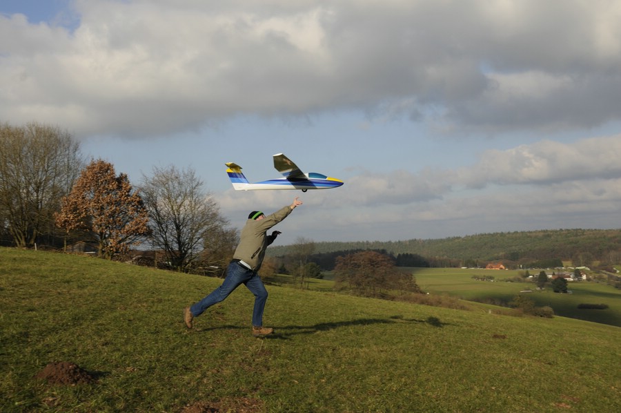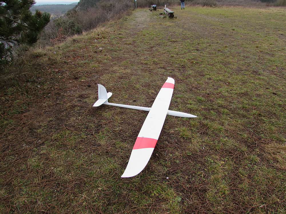Heute reichlich 4 Bft am Südhang direkt von vorne und -2°. Zuerst viel Spaß mit Amokka, aber die Landung war ein Dreher und hat das Ruderhorn aus der Klappe gerissen. Beim zweiten Flug waren die Finger trotz Windschutz so kalt dass ich die Knüppel nicht mehr spürte und die Daumen nur anhand der Modellbewegung gemacht habe um den Miniray sicher zu landen. Nach dem aufwärmen ging dann noch ein schöner Flug mit dem Miniray und die Daumen wären an die Kälte gewöhnt gewesen, aber dann kam um 11:50 Uhr der Schneefall zum Wind und die schlechte Sicht trieb mich heim zu heißem Kaffee. Trotz des kurzen Vergnügens hat sich die dreiviertel Stunde draußen gelohnt :)