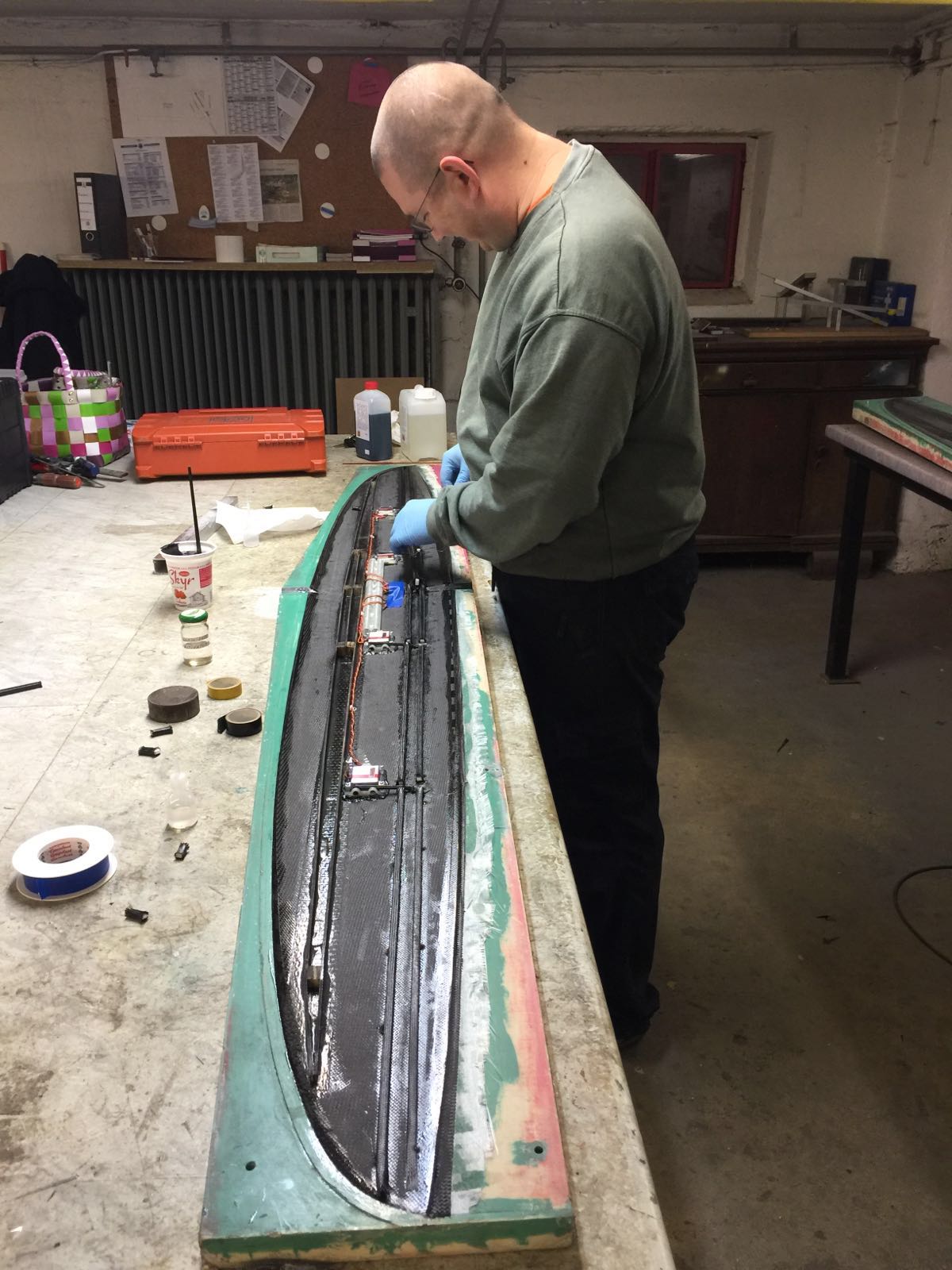 Zunächst Stege und Ballasttaschen plaatzieren Danach Mumpe drauf, zugemacht und ein paar Stunden gewartet... 1371g incl. Servos und Anlenkungen