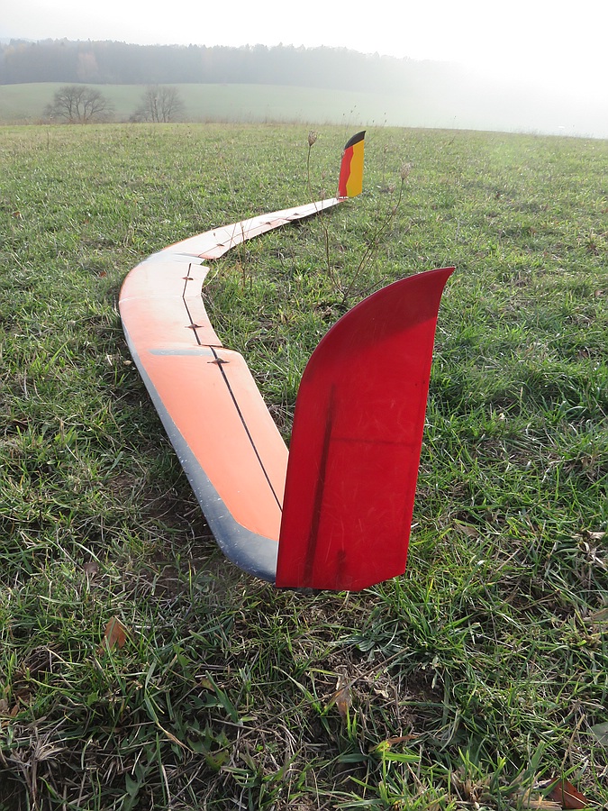 Beim letzten Flug ging der Dispar beim leichten enger ziehen des Kreisflugs plötzlich in den Abriss und Taumelsturz, nach einer ganzen Umdrehung Trudeln konnte ich nach viel Höhenverlust weich abfangen, aber die Fluggeschwindigkeit war noch hoch, ein Winglet riss beim Bodenkontakt wieder ab und ich konnte nicht alle Teile wieder finden um das auf der Flugwiese zu reparieren.