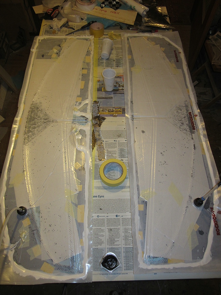 Auch wenn die Versuchung groß ist, die Kanten nach dem evakuieren nicht ausstreichen (um Luftblasen heraus zu streichen). Man streicht das Harz aus dem Gewebe heraus, das wird vom Vlies oder Küchentuch aufgesaugt und zurück bleibt ein Lunker...