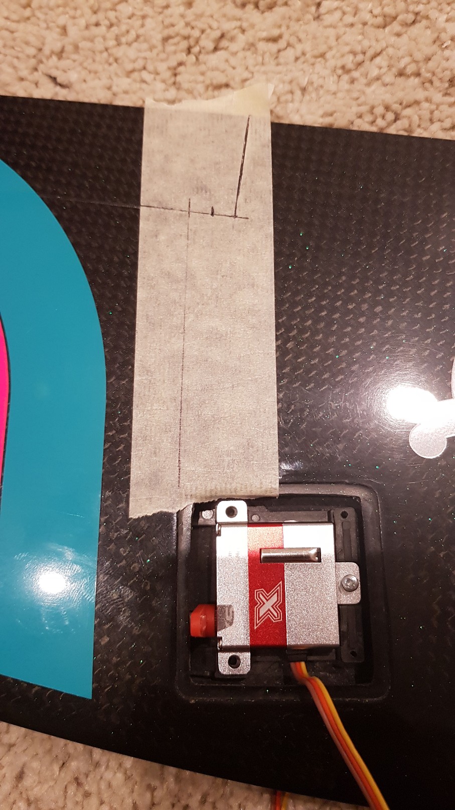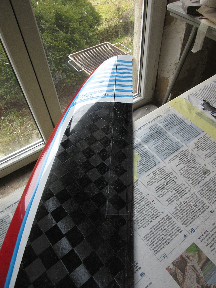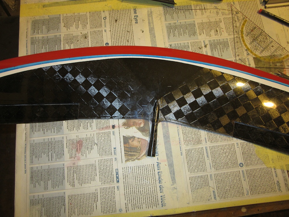 bei mir gehen beim Lack oft die Experimente schief, ein einfaches Design mit ein paar Farbstreifen wie jetzt wieder auf der Unterseite meines XBOW macht in der Regel keine Probleme. Jetzt ist auf der Oberseite das Rot sehr gut geworden, das Weiß in Verbindung mit dem pigmentierten Klarlack macht Probleme.