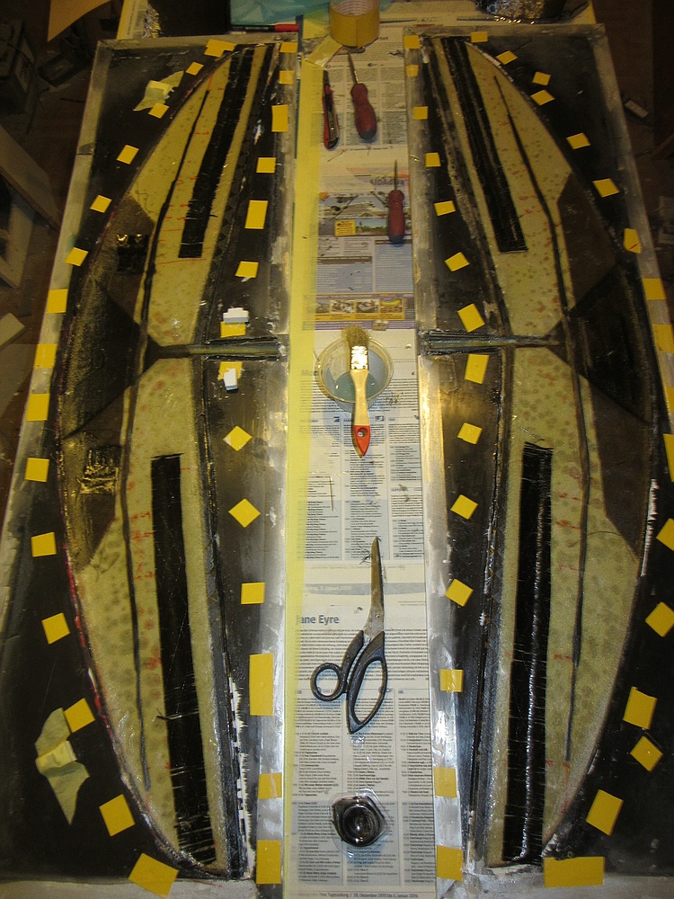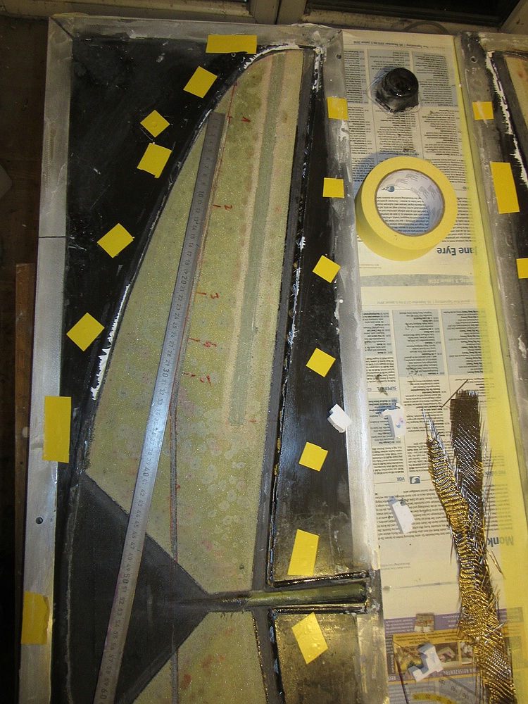 Innenlage soll 50er Glas und ein paar schmale Reststreifen ST-Kohle am Ruderscharnier und auf der Gestängeachse werden, die wird separat mit den Holmgurten eingesaugt.