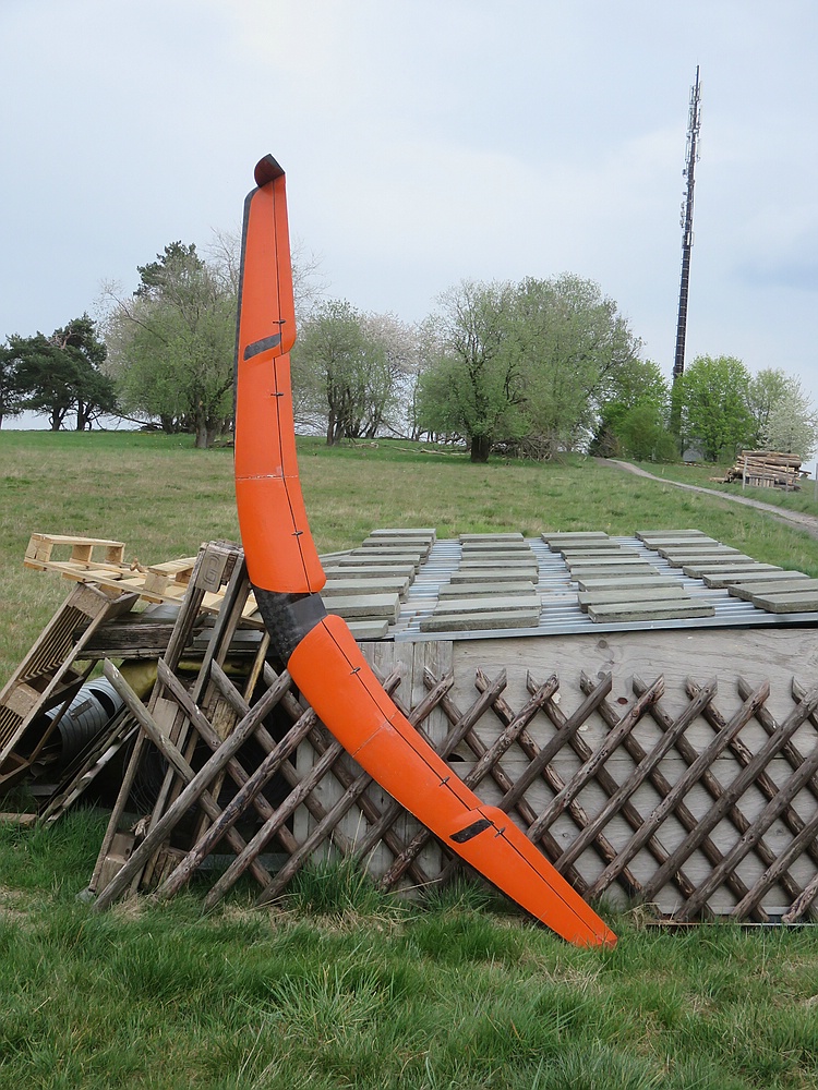 Heute erste Testflüge der 2,7 m-Version des Lackfehler-Prototyps aus der Flitsche. Bis auf zu viel Höhentrimm und Höhenruderausschlag sah das zunächst ganz gut aus, aber beim 3. Flitschenstart hatte ich im Kreisflug einen Abriss, der nach genau einer Umdrehung Trudeln und erfolgreichem Abfangen in einer relativ sanften Baumlandung endete.