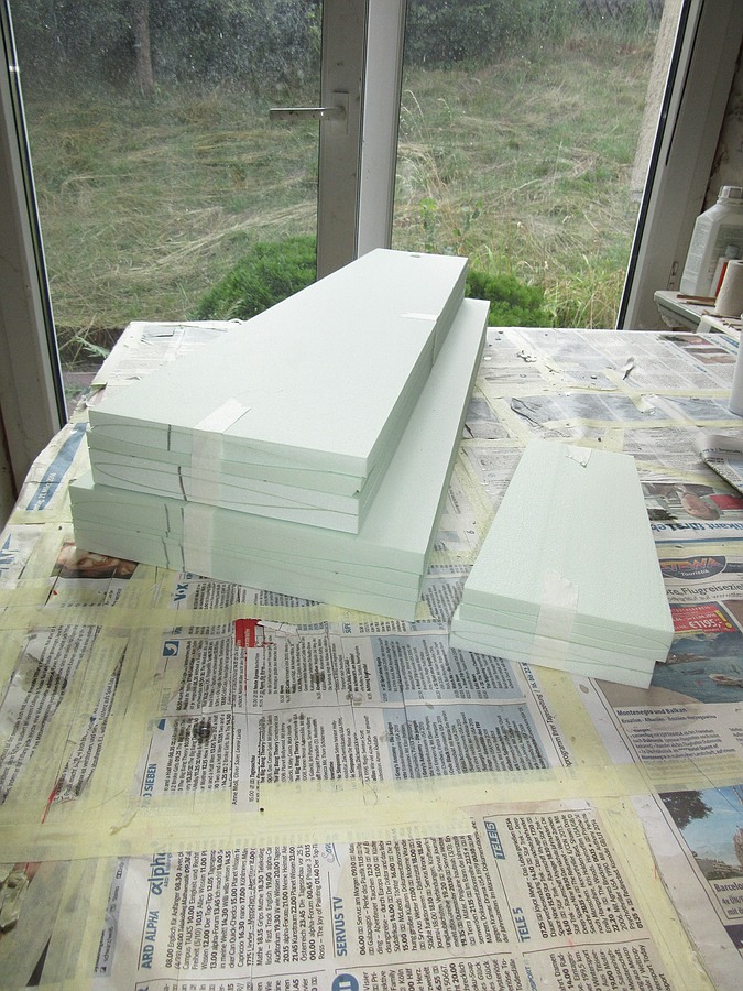 Die Kerne für Flächen und Höhenleitwerk habe ich mir von Wolfgang Watzke ("Wattsi" bei RC-Network) aus Styrodur schneiden lassen. Die Qualität ist sehr gut. Der Flügelaufbau soll ähnlich wie beim meinem Strong-Mini Eigenbauflügel mit Kohleholm und CFK-unterlegter 04er Sperrholzbeplankung ausgeführt werden.