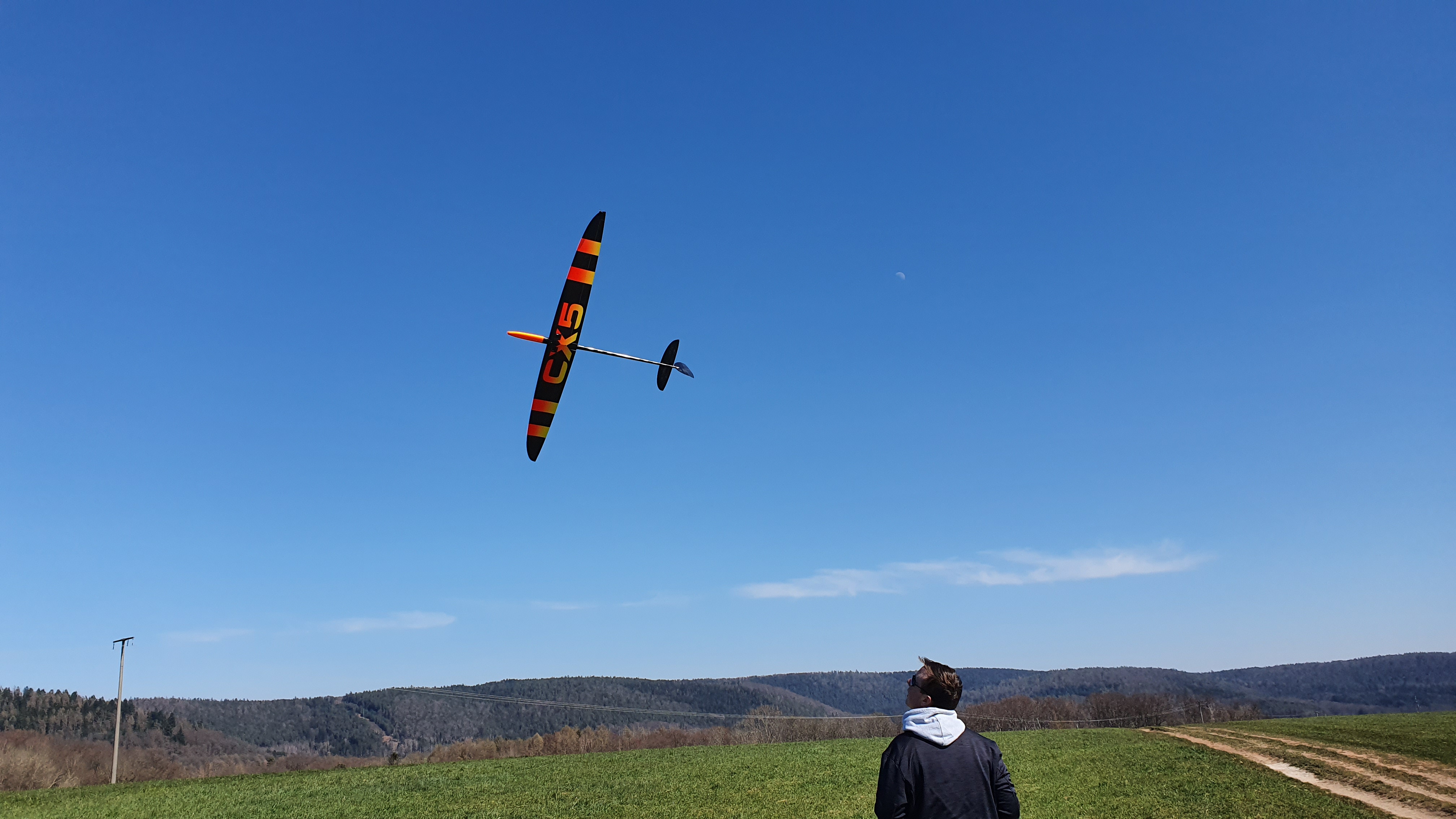 Ging dann weiter, Cass, DLG schmeißen ca. eine Stunde (… werfen ist SCHWER, und ich hab durch die so nervig zwischenreinkommenden Herzinfarkte kaum Thermik kurbeln können), und der letzte Cass-Flug war wieder klasse. Ca 40min mit verstecktem leichten Steigen, gaaanz gemütliches weiträumige Kreisen. Und man kam wenn man’s wirklich drauf angelegt hat doch hoch.