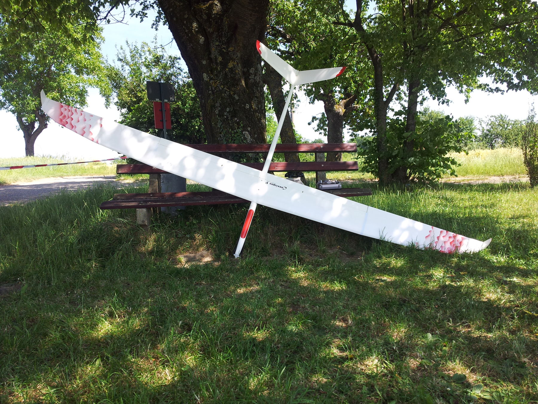 Der Schwerpunkt lässt sich sicher noch optimieren, ebenso die Trimmung für bestes Gleiten, aber Spaß macht es schon so. Dafür, dass ich vor 16 Jahren am Hang zu fliegen aufgehört habe und jetzt mit einer Eigenkonstruktion in der Ebene Thermikfliegen lerne bin ich zufrieden.