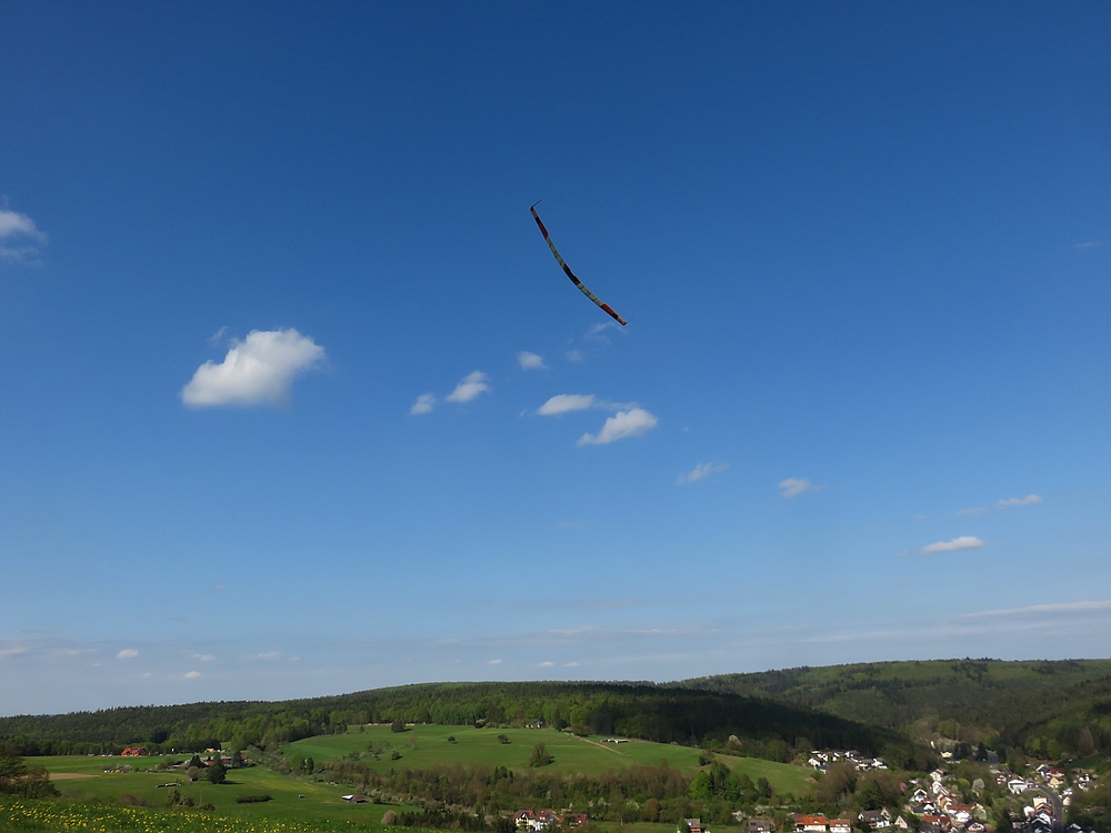 Man muss ziemlich schnell fliegen und vor allem beim Thermikkreisen kommt man versehentlich schon mal an die Abrißgrenze und der Pfeil fängt an zu Trudeln. Im Gegensatz zur früheren Flugerprobung ist das Trudeln nach Höhenruder los lassen aber immer nach genau 1 Umdrehung beendet und der Pfeil liegt wieder sicher am Knüppel.