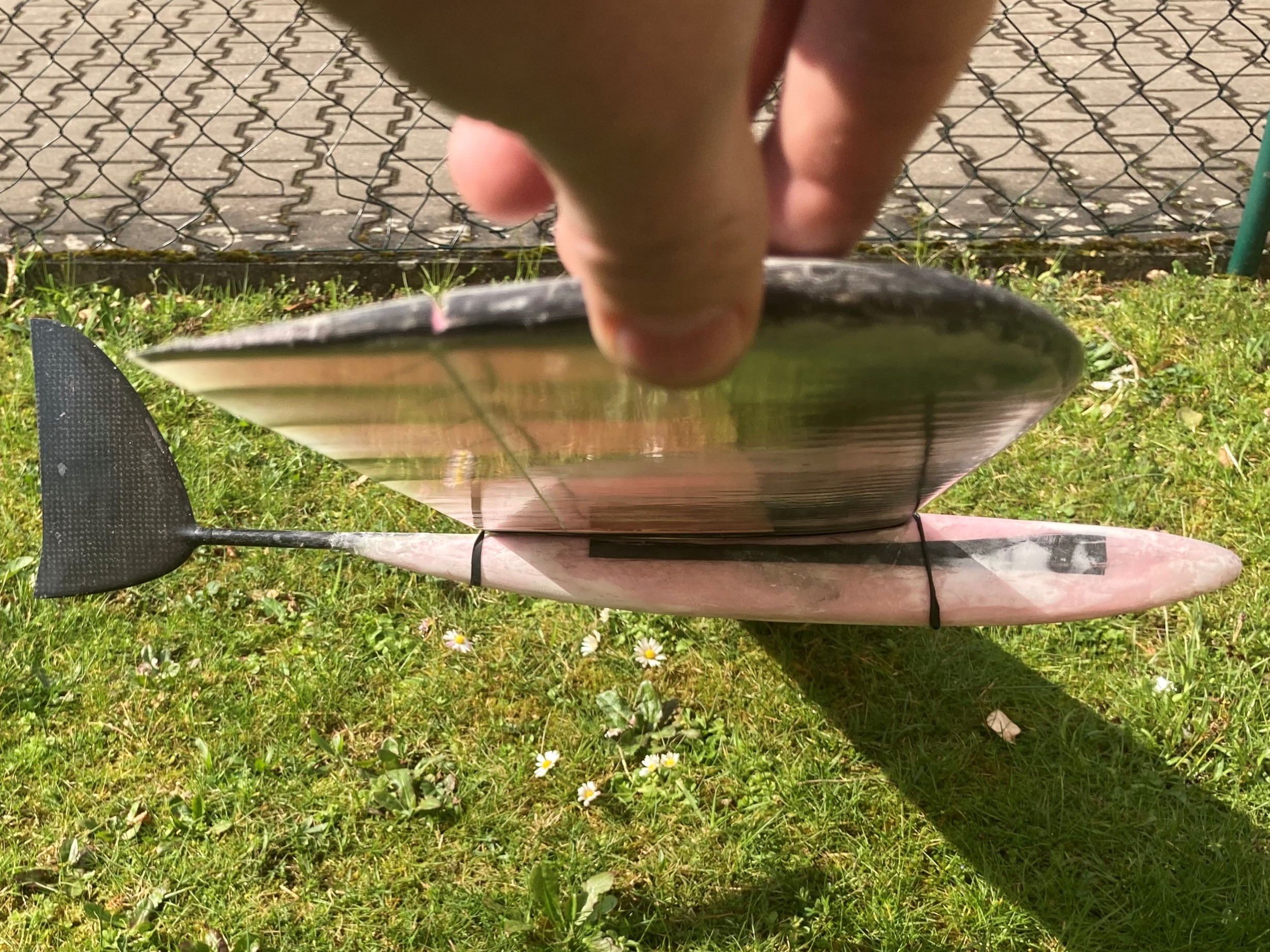 - Ein Kohlefaserrohr vom X-Bow ist für eine Finne mit PU-Leim eingeklebt worden, noch zu lange, wird erflogen