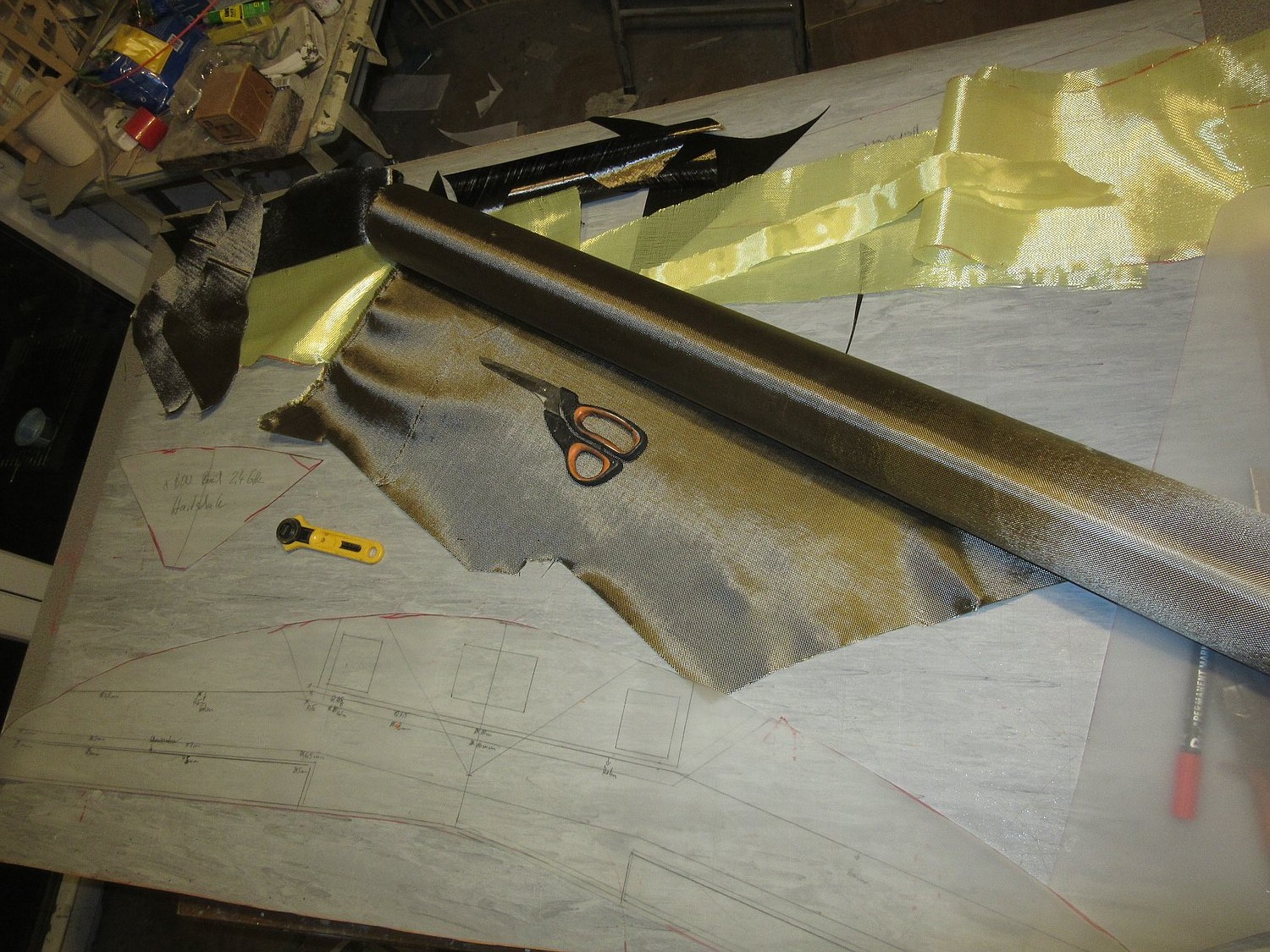 Ich bin happy keine Luftblasen in der Nase und um die Servoöffnungen. Die Oberfläche kann paar Gramm mehr Harz vertragen das nächste Mal. Das Hybrid Gewebe erfordert etwas Vorsicht bei der Verarbeitung da man jeden Verzug sofort sieht. Die Oberseite habe ich zuerst eingesaugt. Man sieht es... Den Gurt kann ich noch viel dünner bauen.