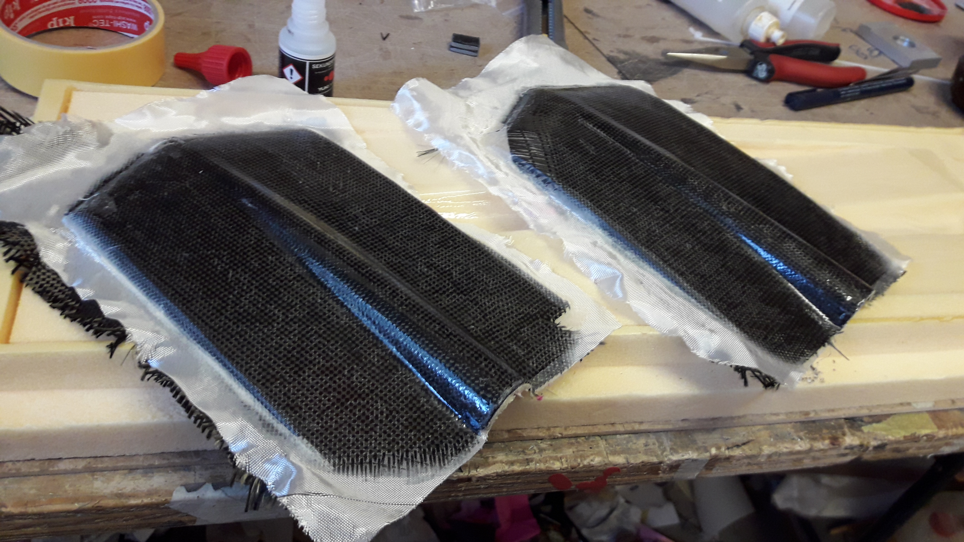 In Styrodur negative gefräst, tesa rein, einmal dick gewachst und mit PVA eingerieben. Nach dem das PVA trocken war direkt 2 lagen 80er CFK hinterher und ab ins vakuum. Am 13.06. Durfte dann alles ausgepackt werden