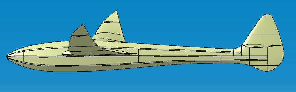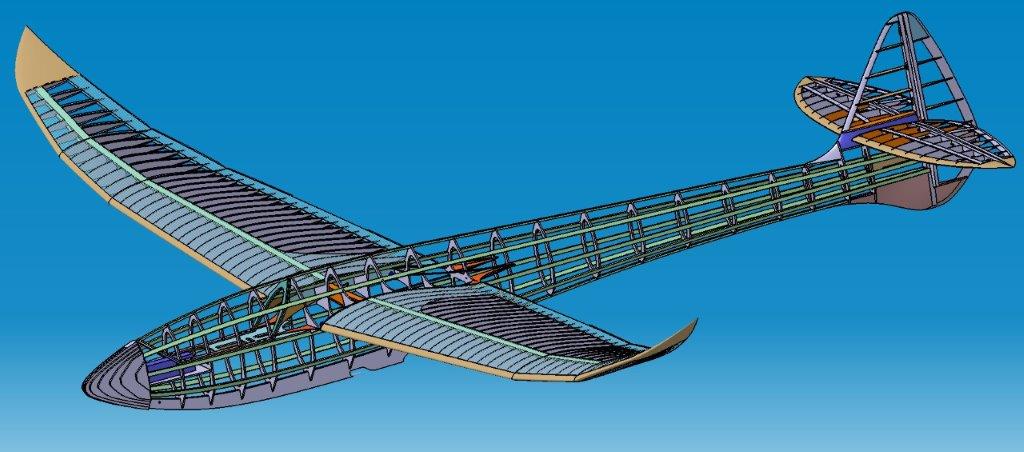 Im Oktober begann ich das Modell im CAD zu zeichnen. Ziel war es in Originalgroesse mit knapp 3,5m Spw nachzubauen, Steuerung sollte nur über Höhe und Seite erfolgen. Ich wollte unbeding ein LDA Profil testen und auch wenn ich keine Zirkulationsberechnungen durchführe so schaue ich mir doch die Profilpolaren an und diese haben mich sehr überzeugt, zeigten Sie doch wirklich einen sehr geringen Widerstand. Im Aussenflüggel nach dem letzten Knick ist das Profil auf ein entsprechendes Aussenprofil gestrakt in einem nicht linearer Schränkungsverlauf.