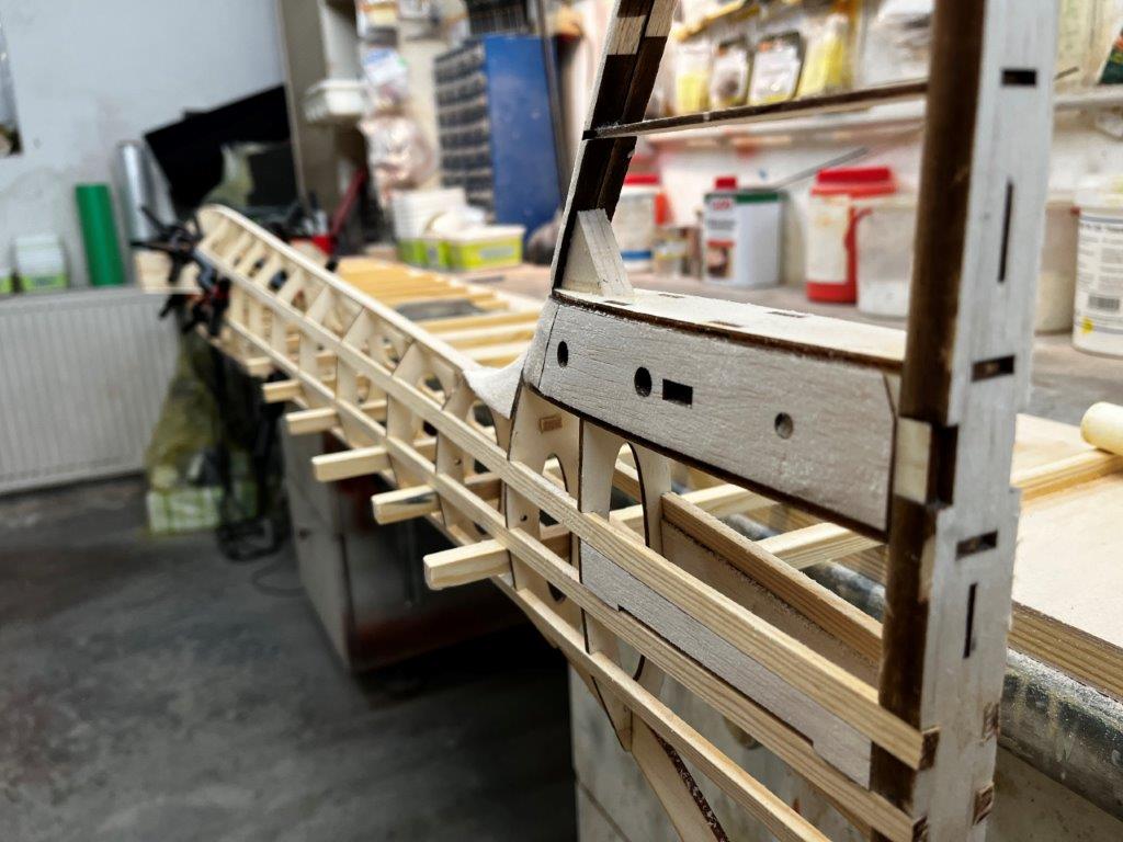 Hier sitzen die Spanten schon zu einem Großteil auf der Helling: