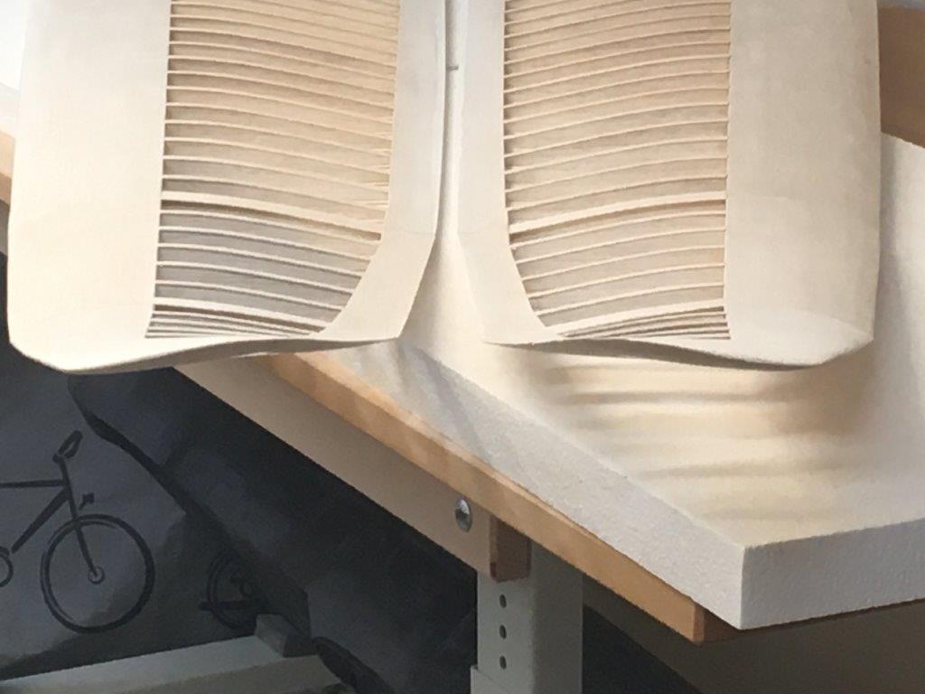 Der eigentliche Bau begann dann Anfang Januar, hier mal ein Eindruck vom Flügelverbinder, er entsteht durch mehrlagiges Balsa mit Passlöchern und gelaserten Schlitzen in die CFK-Rovings gekämmt werden, danach wird er sauber ausgeschnitten und mit einem Schlauch gegen Aufspleißen geschützt, so ein Verbinder ist federleicht dieser hat so ca. 120 gr.