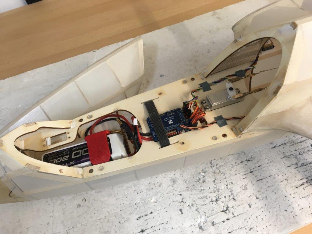 Da es sich hier um einen sehr thermikempfindlichen Segler handelt, der keinerlei Abstiegshilfen hat ausser ggfs Trudeln, was noch zu testen ist, habe ich eine Flightcontrol Matek F405 wing verbaut. Bereits meine 2. in dererlei Modellen. Die FC kann natürlich eine ganze Menge, der Hauptgrund für den Einbau ist aber der, daß man verhindert in der Thermik ausser Sicht zu geraten und dann davon zu fliegen. Man kann die GPS Koordinate loggen oder RTL-Return to Launch schalten und das Modell bleibt am Ort wo man grade ist bzw fliegt zum Start oder Einschaltpunkt. Ich setze dafür immer sogenannte Ralley-points, das sind homepunkte, die nicht unmittelbar am Einschaltpunkt liegen sondern mittig im Flugfeld. Dadurch kreist das Modell nicht über der Vorbereitungszone sondern bleibt im Flugkorridor. Wen das Thema mehr interessiert der kann sich hier mal meinen vollautomatischen Segelflug am Hang ansehen. (Modell Cirrus magic)