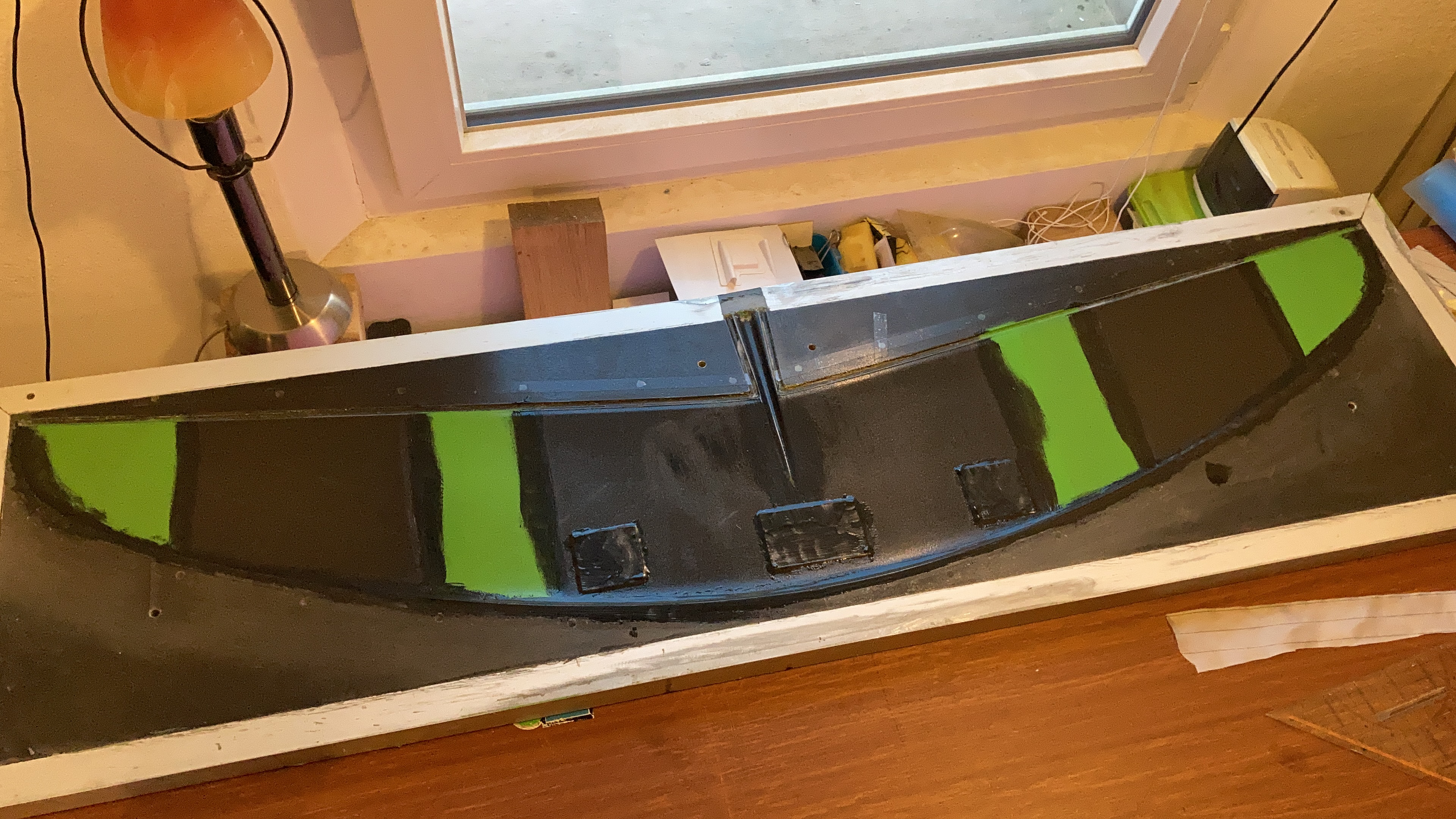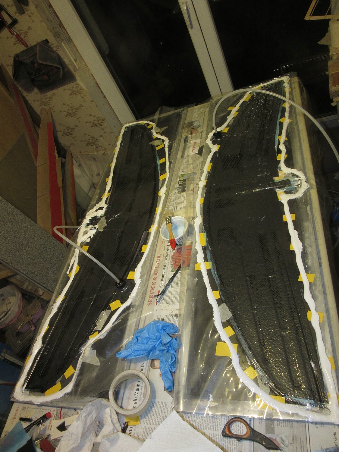 Ich bin happy keine Luftblasen in der Nase und um die Servoöffnungen. Die Oberfläche kann paar Gramm mehr Harz vertragen das nächste Mal. Das Hybrid Gewebe erfordert etwas Vorsicht bei der Verarbeitung da man jeden Verzug sofort sieht. Die Oberseite habe ich zuerst eingesaugt. Man sieht es... Den Gurt kann ich noch viel dünner bauen.
