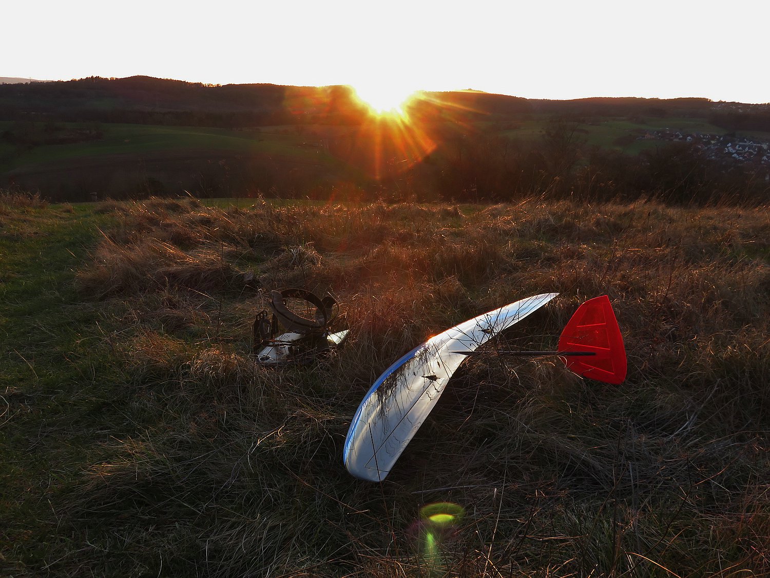als Abschluß eines Sturmwochenendes für die schweren Flieger wars Gestern viel ruhiger, der 630 g XBOW2 durfte wieder ran und zeigen was er kann. Nach den fliegerischen Stärken brauchte er am Ende auch noch seine strukturelle Robustheit.