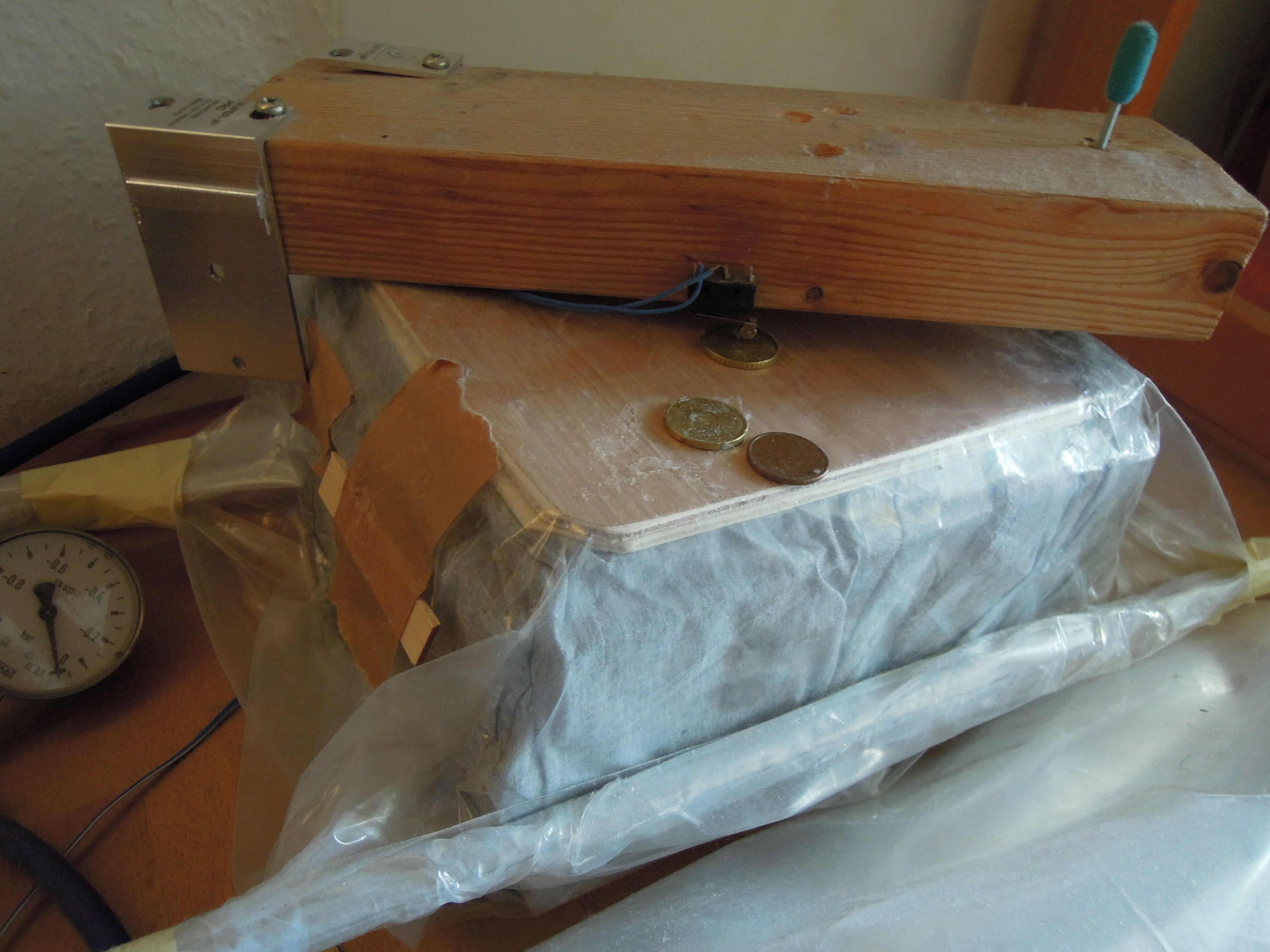 - Viel besser geht eine oben offene Hozschachtel im Vakuumsack (1-2 Liter) für die Pufferung oben mit einem aufgelegten Sperrholzdecke. Diese Sperrholzdecke zieht es im Vakuum nach unten. Damit wird ein Microschalter getrieben. Der Microschalter ist an einem Stück Balken angeklebt. Der Balken wird an einer Seite mit einer Schraube in der Höhe . Die Hysterese ist fein genug um auch mit 0.3 Bar Styropor oder gar Beplankung auf Rippen zu pressen.