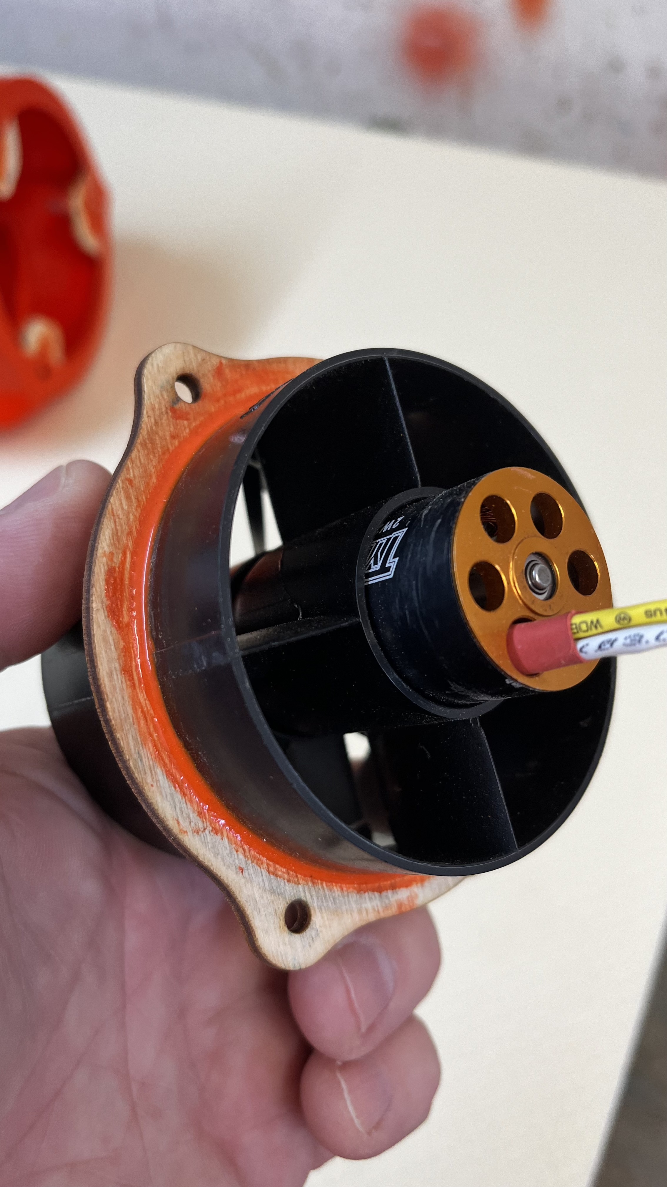 Im Gegensatz zu damals kommt heute beim 2. Flieger der 2.Strömungskörper zum Einsatz, er haengt unter der Flaeche und der Impeller von Wemo hat 70mm aber 1kg Schub, das wird spannend.