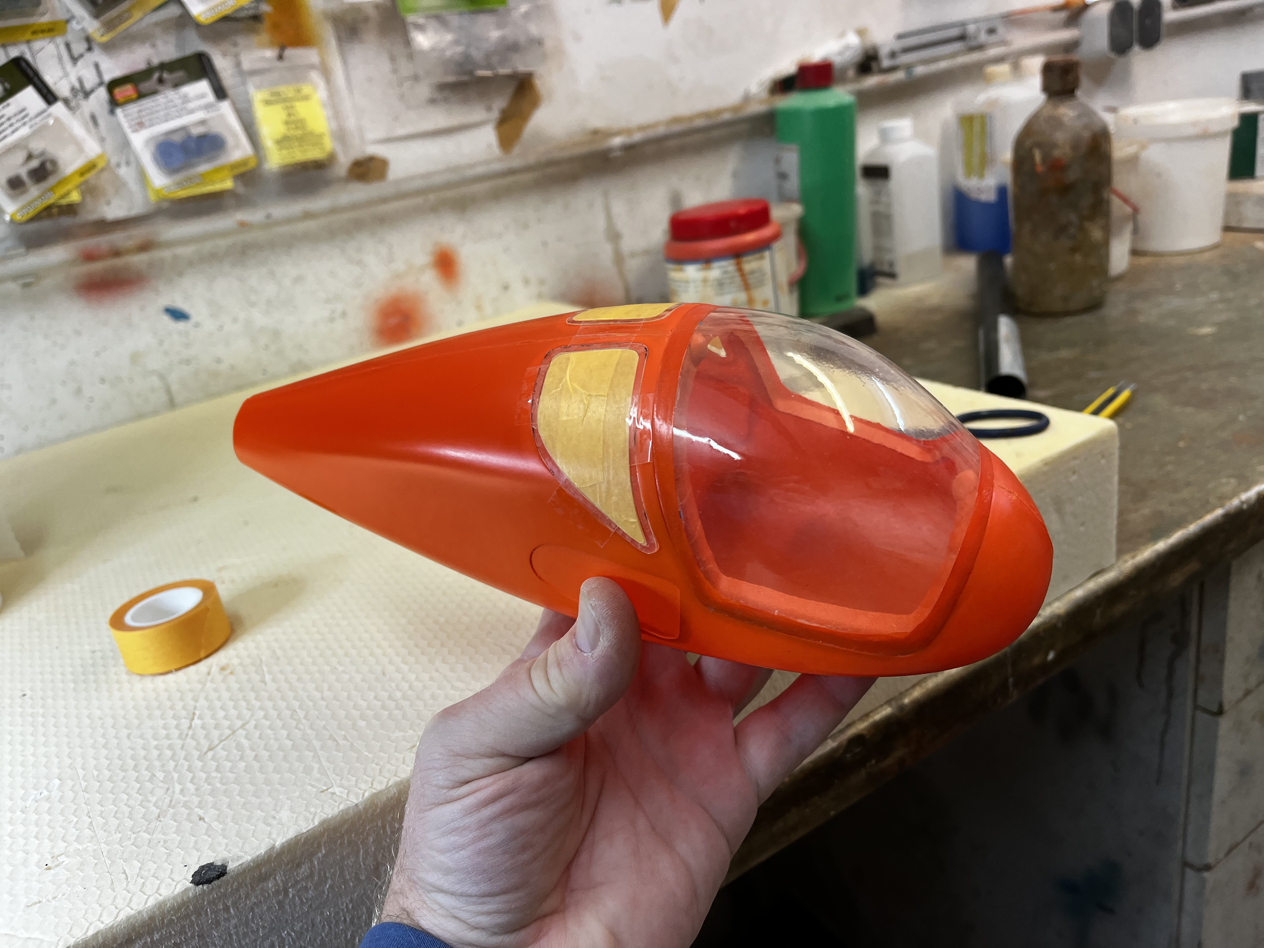 Der Rumpf wurde aus 7 Lagen 23gr Glas diagonal laminiert und wiegt mit Kabinenrahmen, fertigen Scheiben und 4 Magneten 36gr, ein vielversprechendes Gewicht.