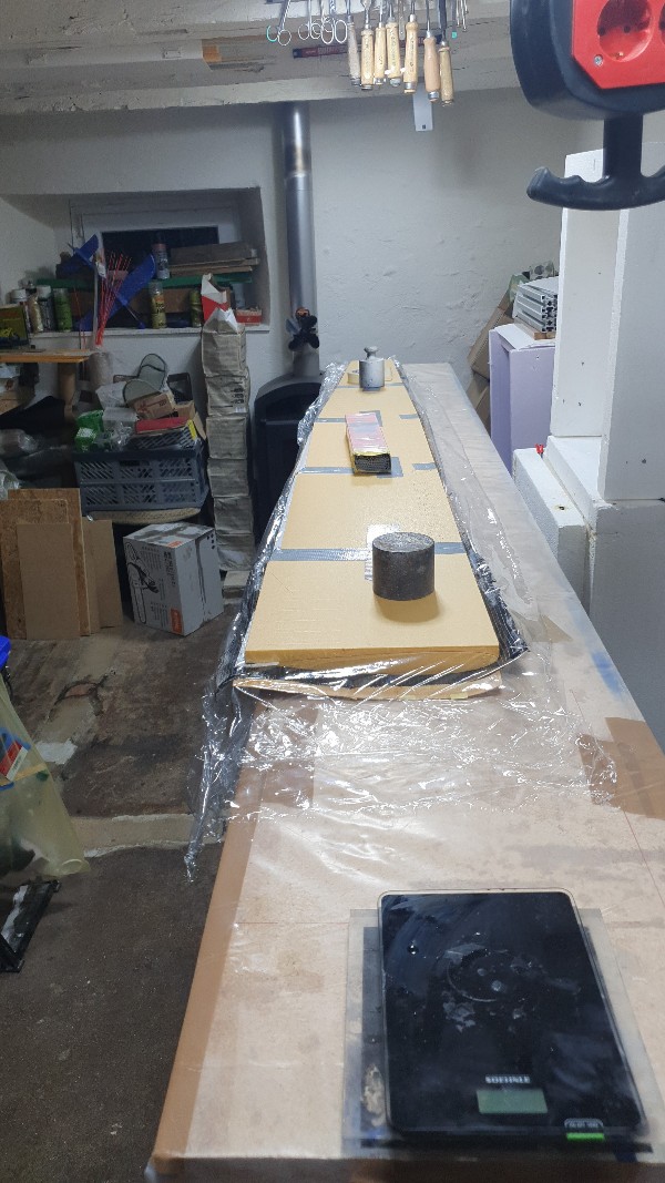 Ich setze dem Harz Schaumtreibmittel zu, damit es sich maximal ins Styro und auf die gesperrte Holzoberfläche drückt, die Verklebung dadurch sicherer wird...