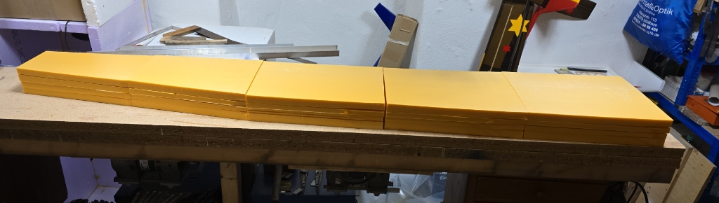 Ja hatte ich gedacht denn die sehen makellos aus deine Kerne d.h. Du brauchst auch keinerlei Holzrippen mehr das is gut ich mache mir immer noch holz Schablonen auch jetzt wieder bei den Sipa minijet Ductings, da is sone Maschine schon klasse. Berechnet der dann die kurven automatisch wenn der kern kürzer oder länger ist, damit an wurzel das richtige profil ist?